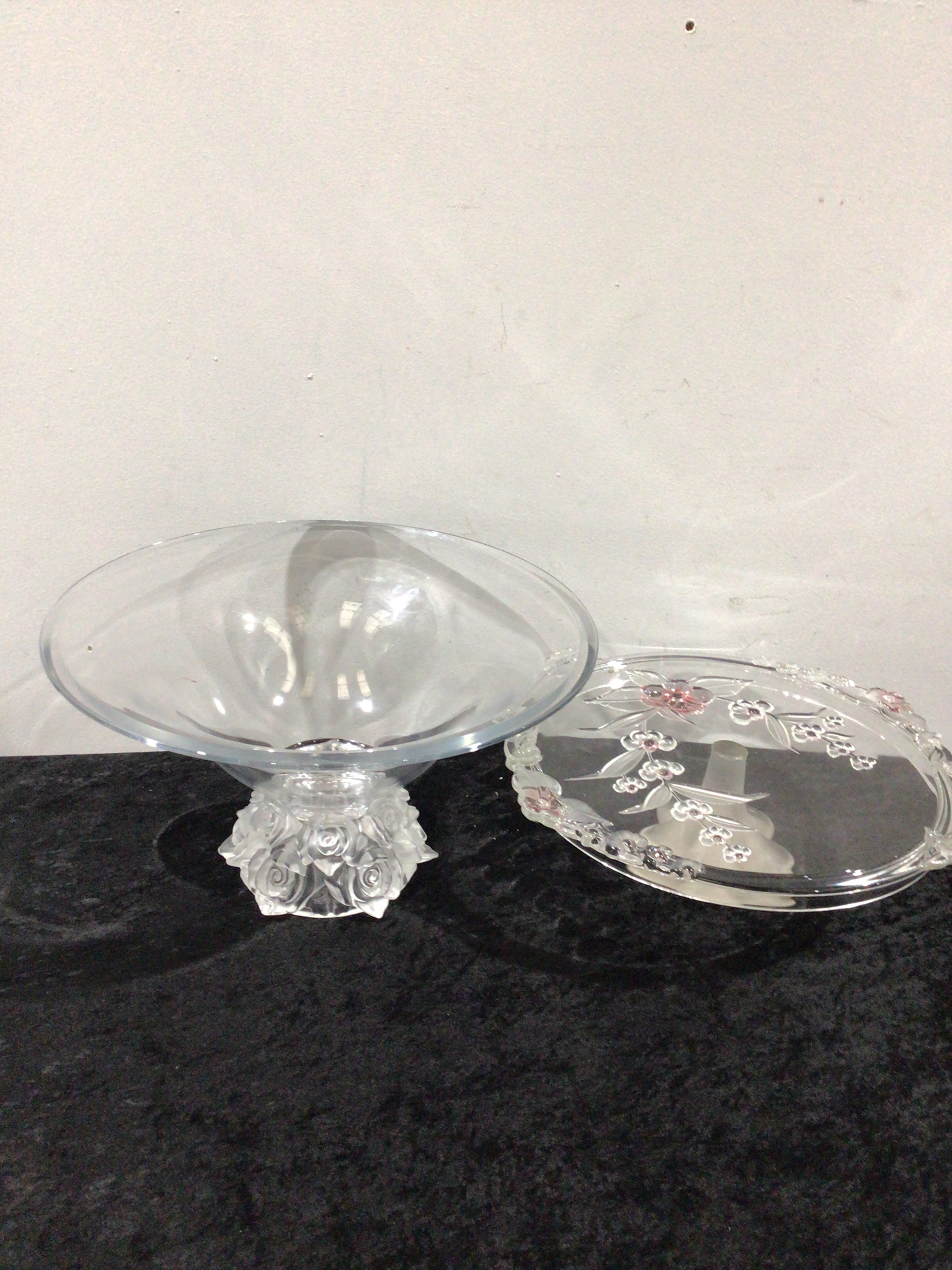This lot comprises two clear glass serving pieces, consistent with late 20th-century to contemporary production. The first is a pedestal compote featuring a wide, shallow bowl atop a thick stem and base molded with a continuous rose pattern. The second is an oval serving platter with a raised rim and integrated handles, adorned with an etched or frosted floral design, possibly cherry blossoms, some elements of which are accented with light pink paint. Both items are constructed from clear glass and exhibit no discernible manufacturer’s marks or text.