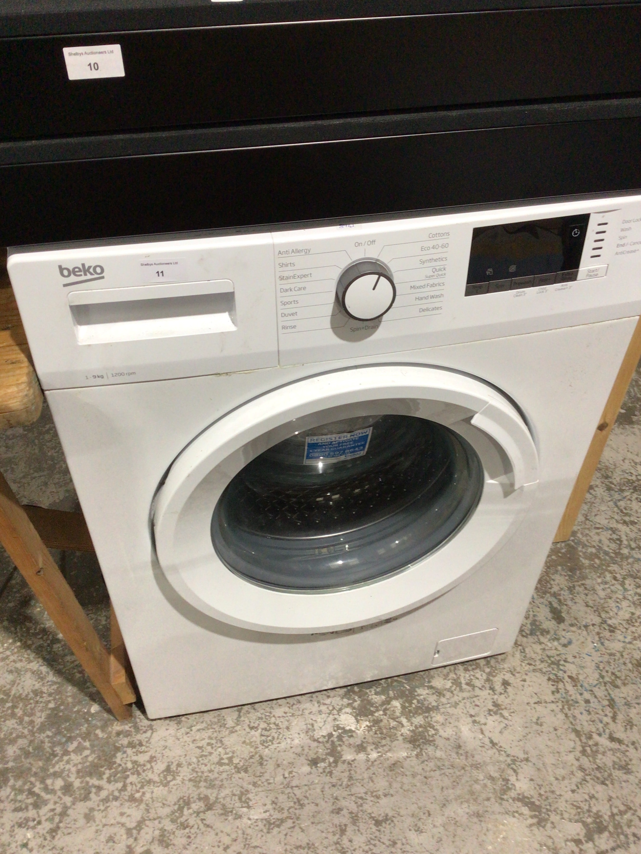 A white Beko front-loading washing machine, labeled ‘1-9kg | 1200 rpm’ with program settings including ‘Anti Allergy,’ ‘Cottons,’ and ‘Spin + Drain,’ and a blue guarantee sticker inside the door.