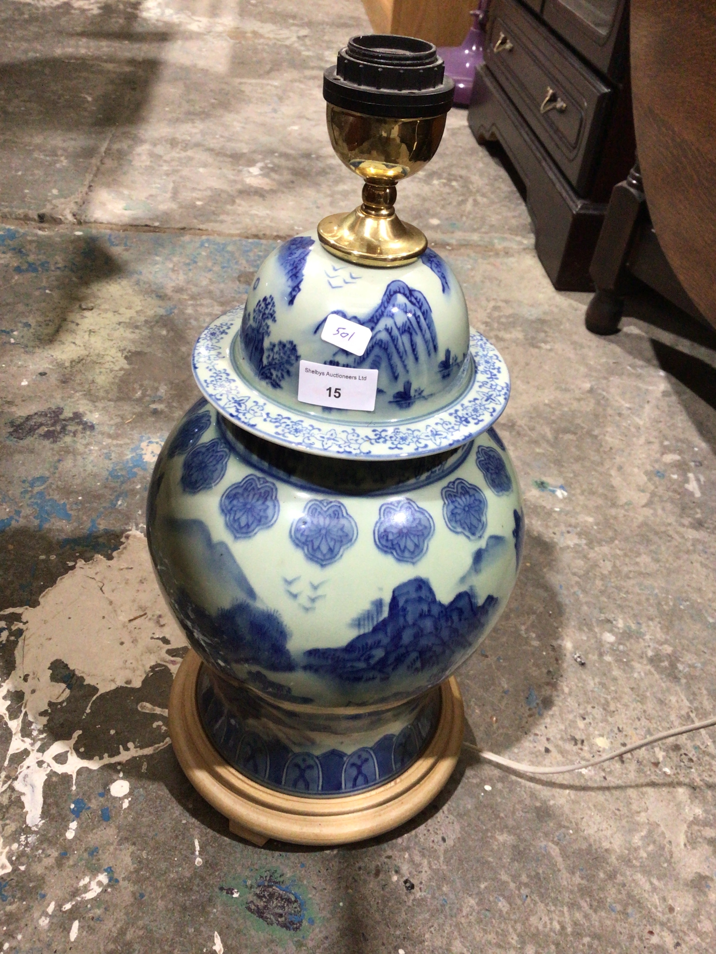 A Chinese blue and white porcelain ginger jar table lamp, with blue landscape and floral patterns on a greenish-white ground, a gold-colored fitting, and a natural wooden base.