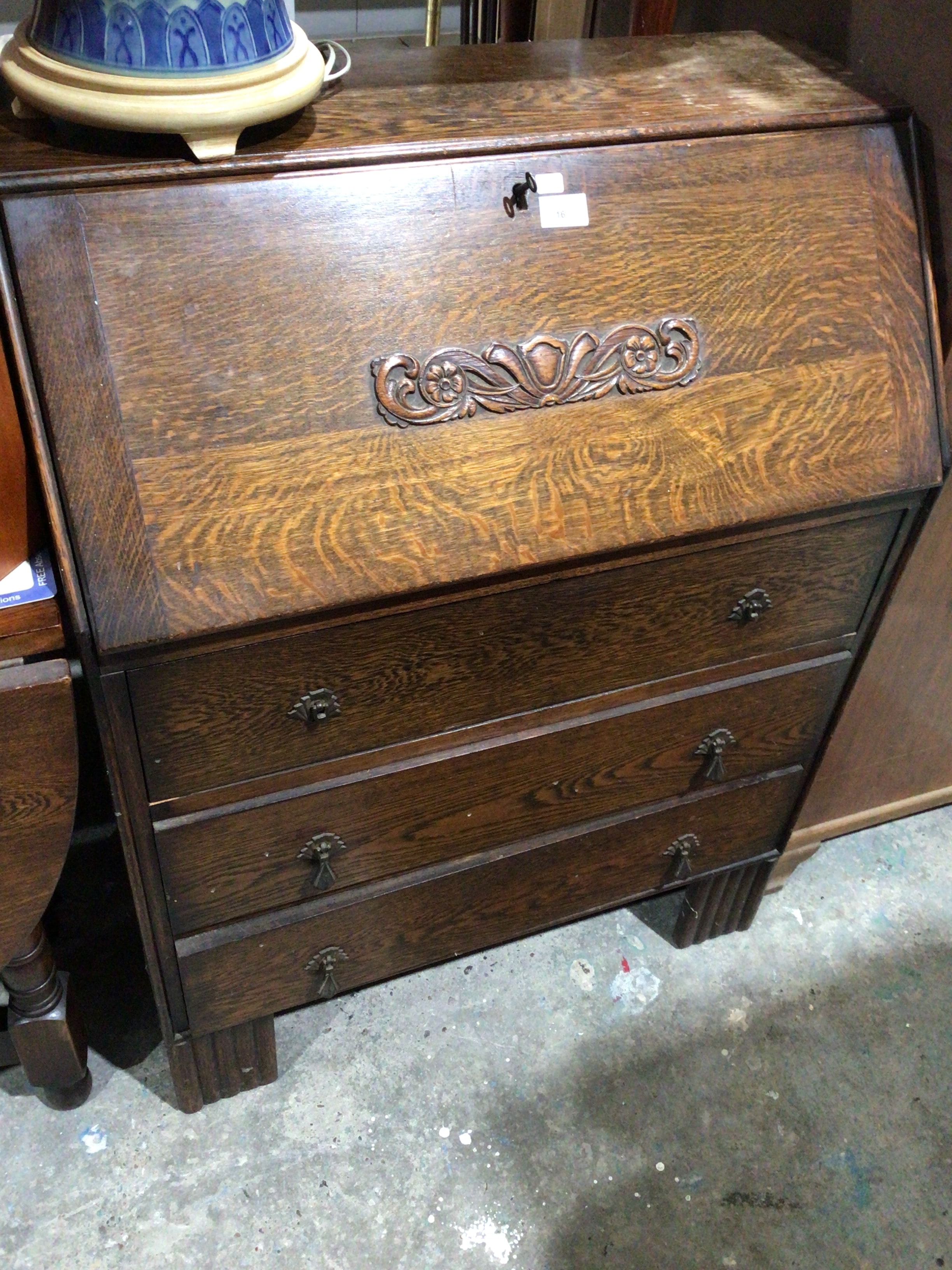 An antique oak secretary desk bureau with a fall-front, an ornate decorative pull handle, and three drawers with decorative metal pulls.
