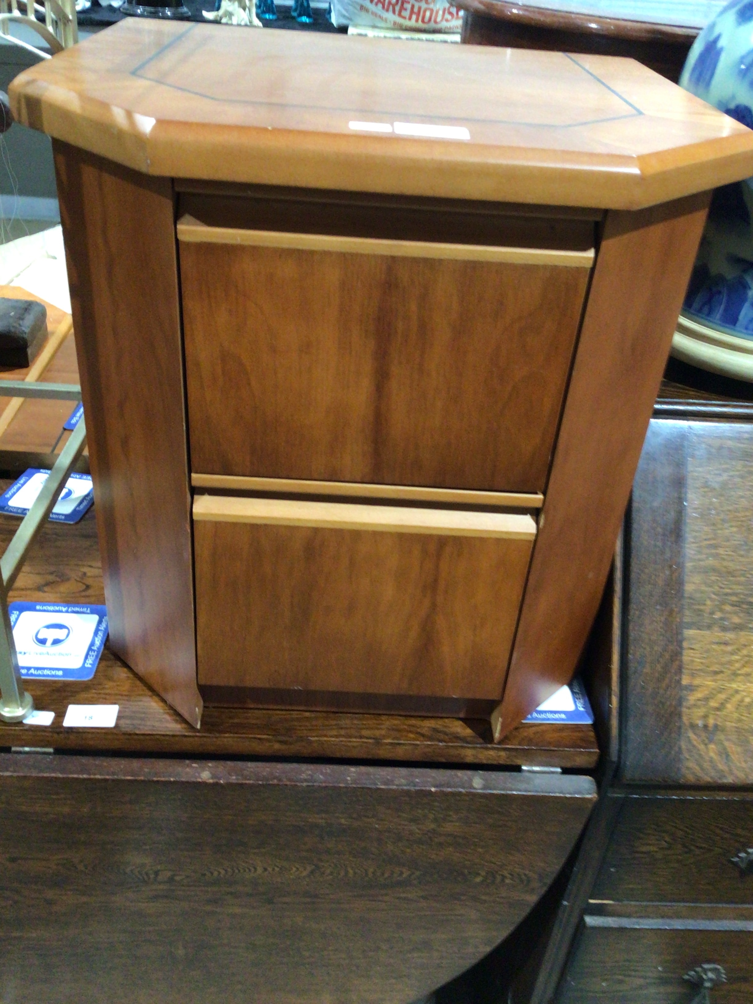 A light to medium brown wooden cabinet with an octagonal top and two drawers.