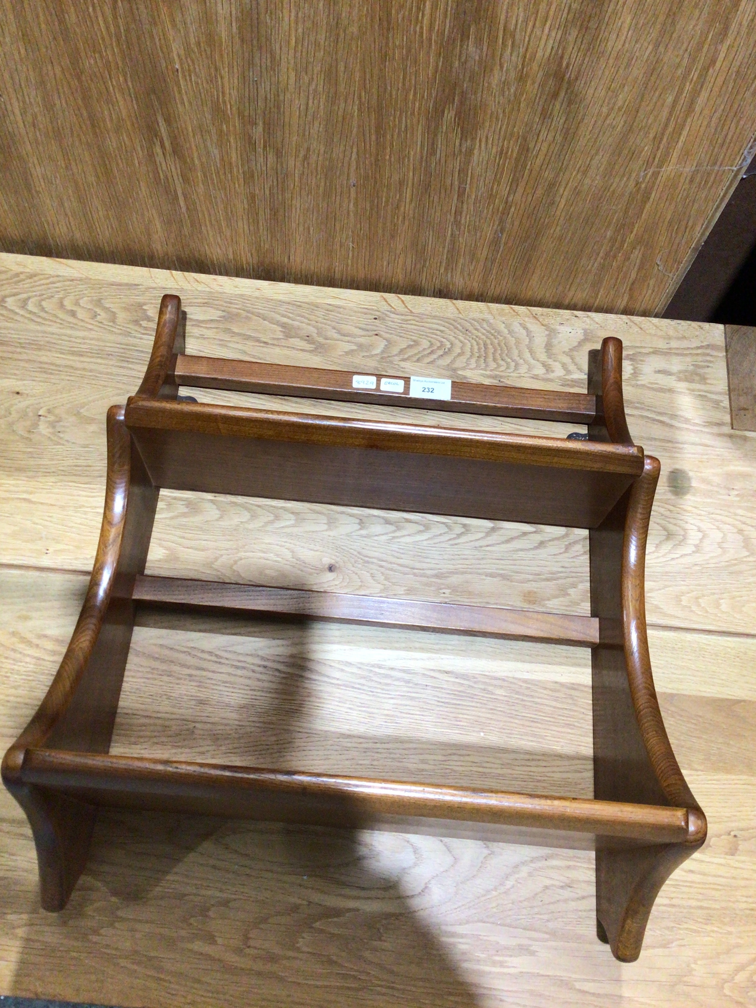 A brown wooden Ercol Vintage Mid-Century elm plate rack, featuring a label with ‘Excol’.