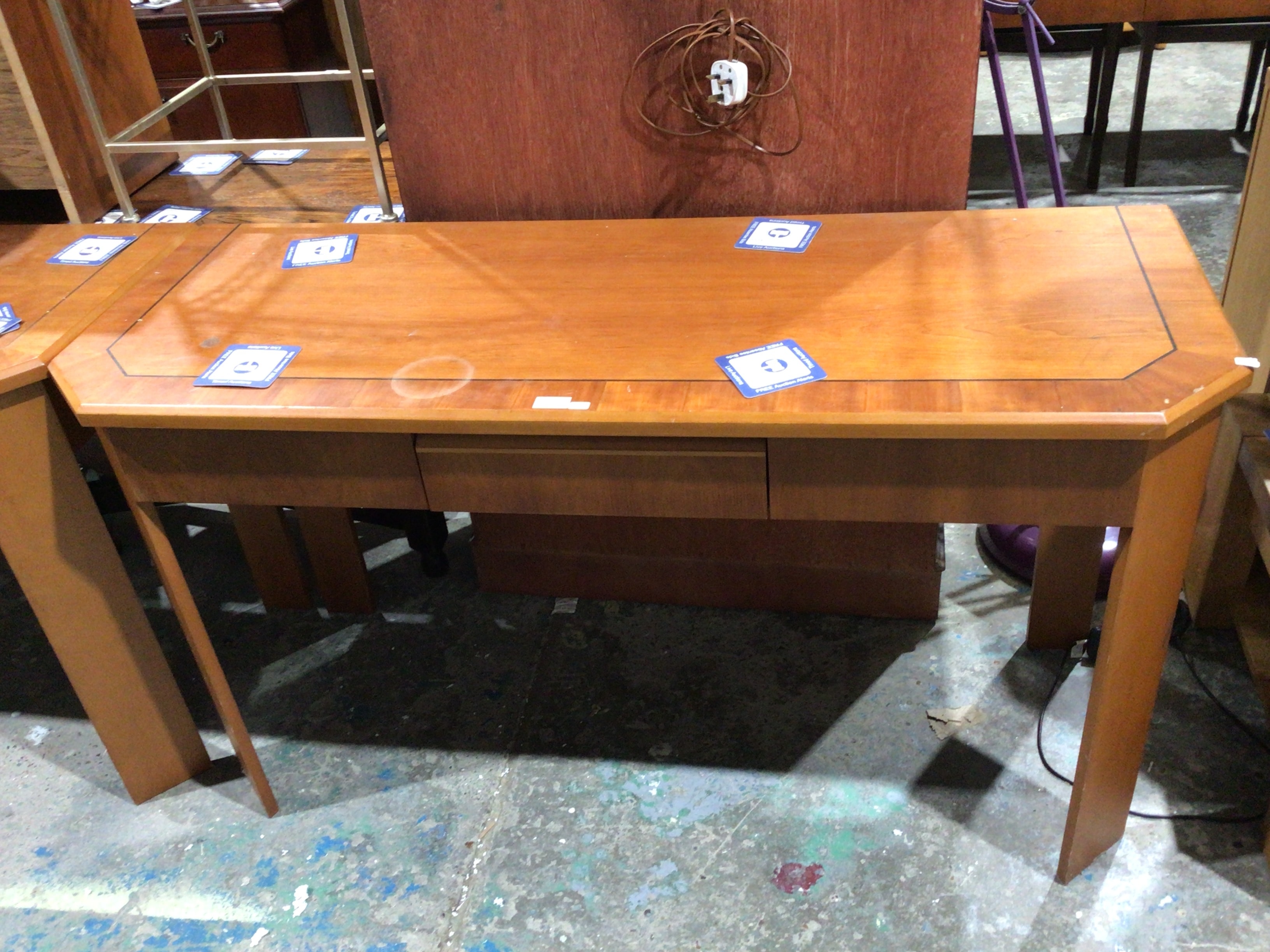 A light brown wooden desk with three visible drawers and a darker wood inlay border on its top.