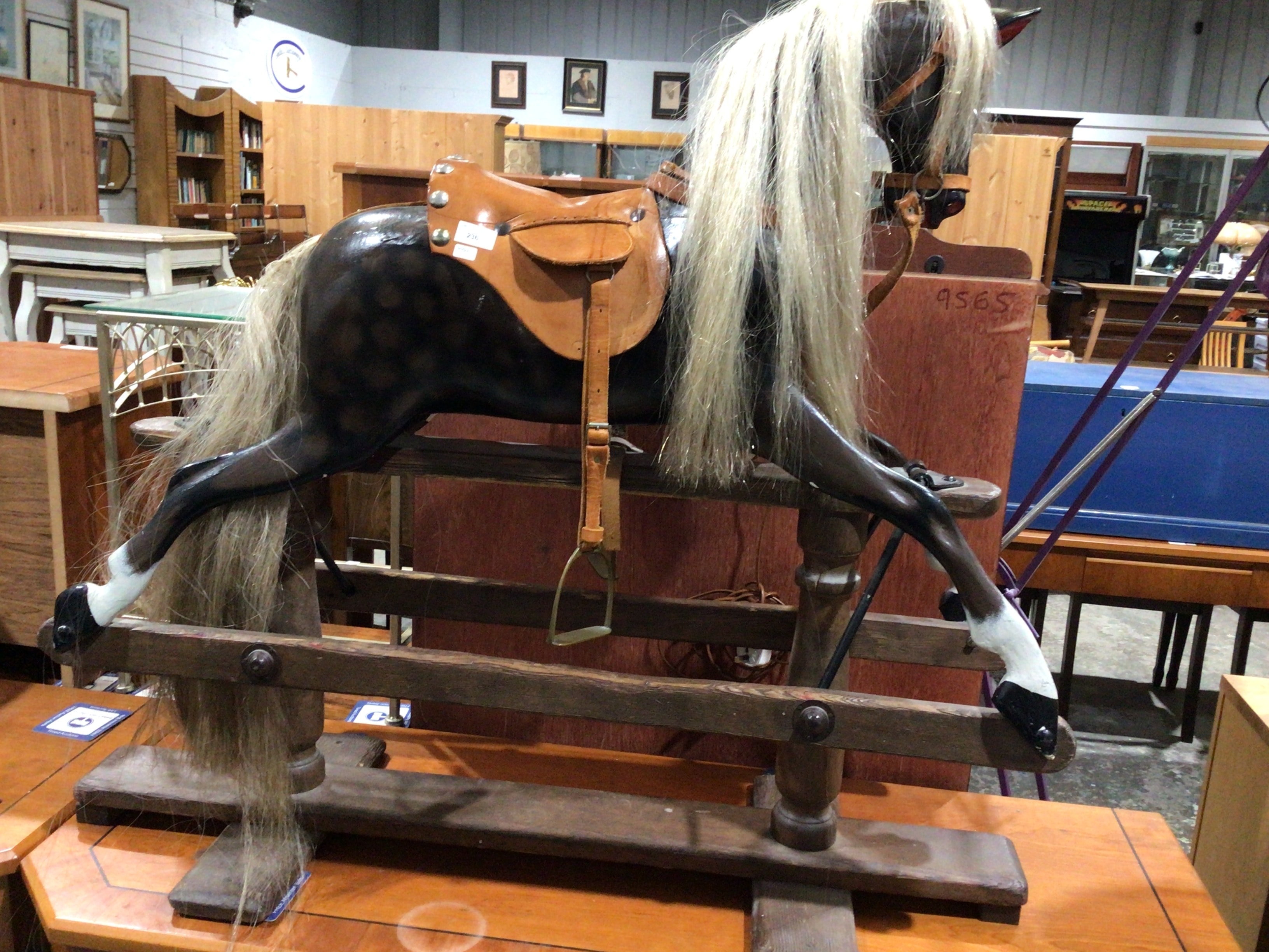 A dark brown rocking horse with white hooves, a light blonde mane and tail, a light brown leather saddle, and a dark brown wooden base.