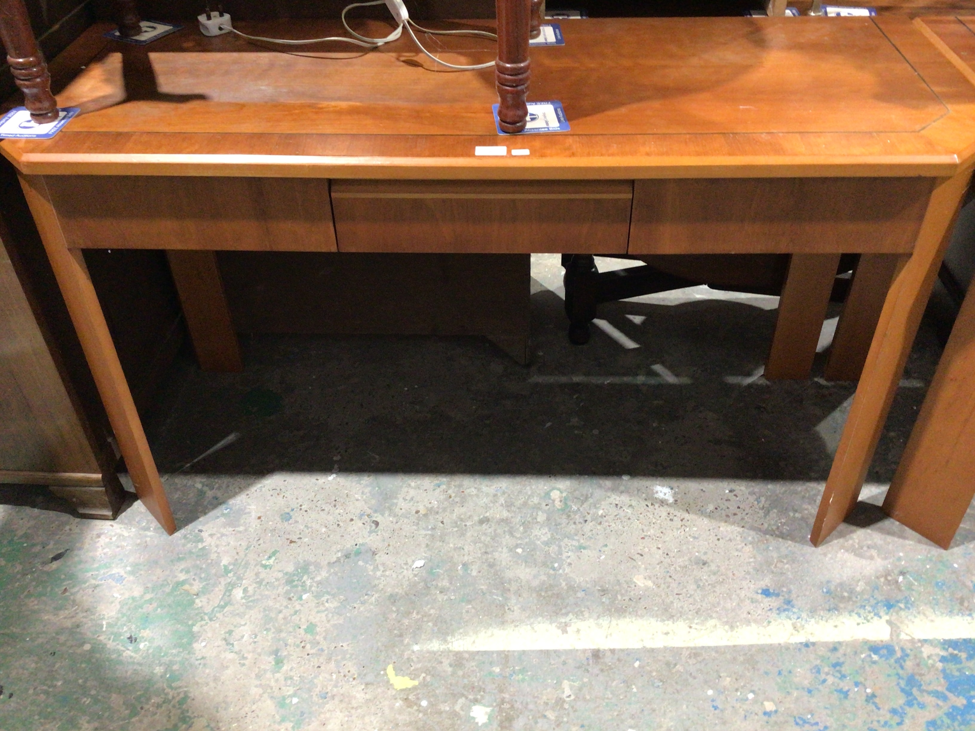A light brown wooden desk in Mid-Century Modern style with a single central drawer.