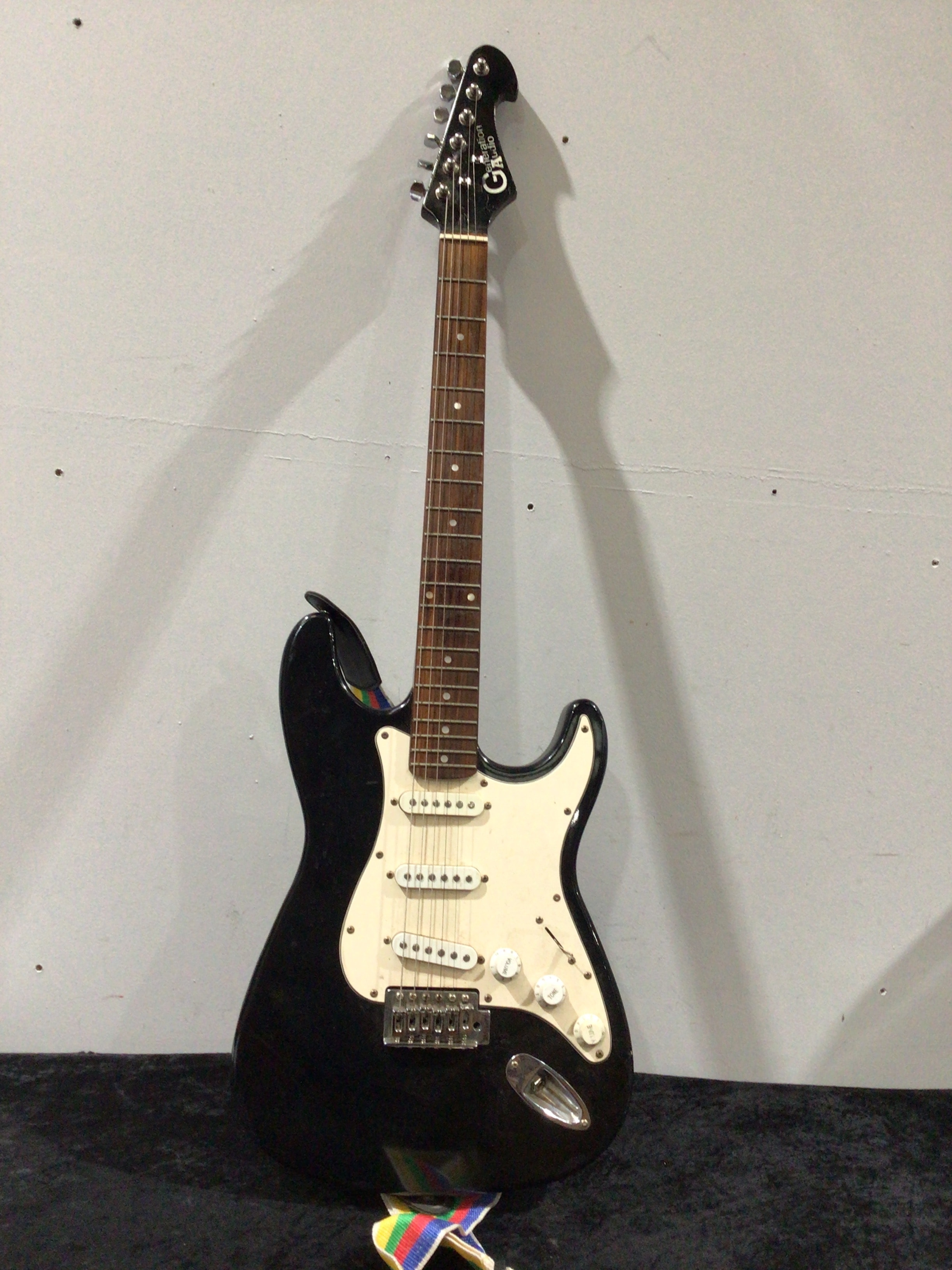 A black Generation Audio electric guitar in Stratocaster style, with a cream/white pickguard, brown fretboard, colorful strap, and “VOLUME” and “TONE” labels.
