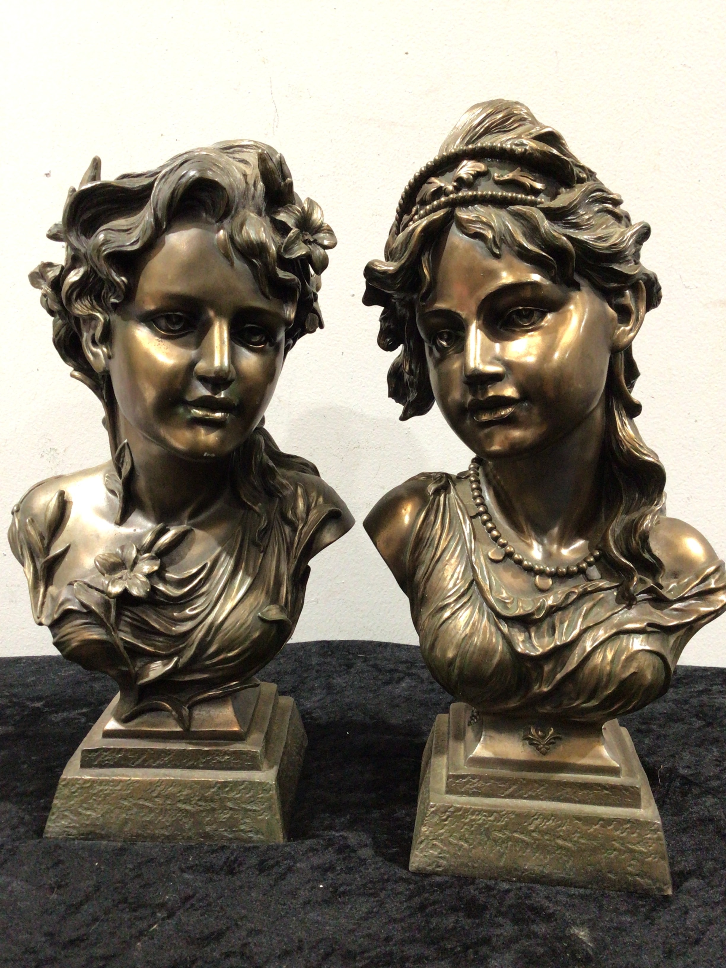 Two dark metallic brown bronze-patinated busts of young women, one adorned with flowers and the other with a beaded headpiece and necklace, standing on stepped bases.