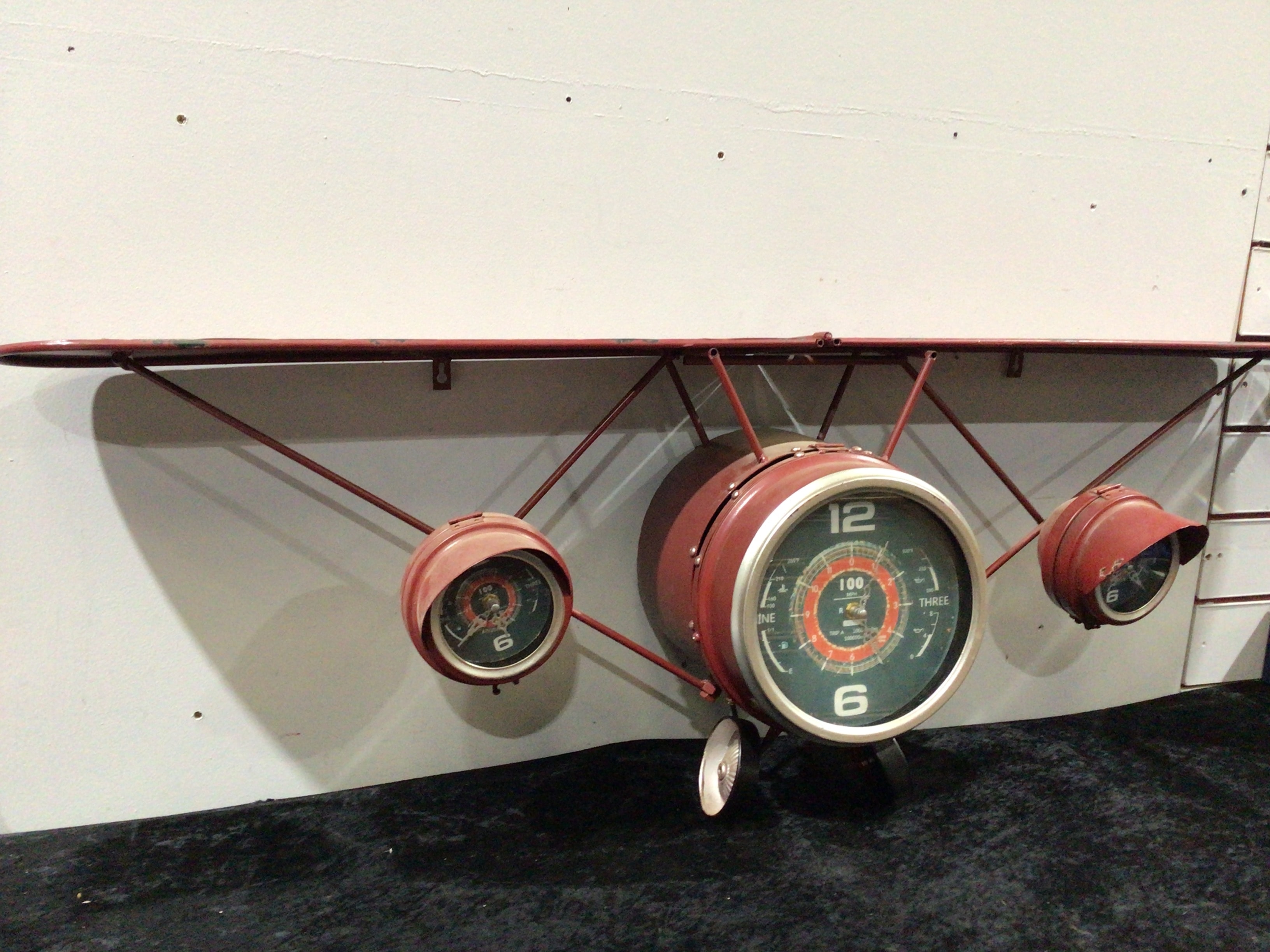A red, airplane-shaped wall decoration with three integrated clocks/gauges; the central gauge displays “12”, “THREE”, “6”, “ONE”, “100 MPH”, and “R”, while the two smaller side gauges each show “6” (upside down) and other instrument-like markings.