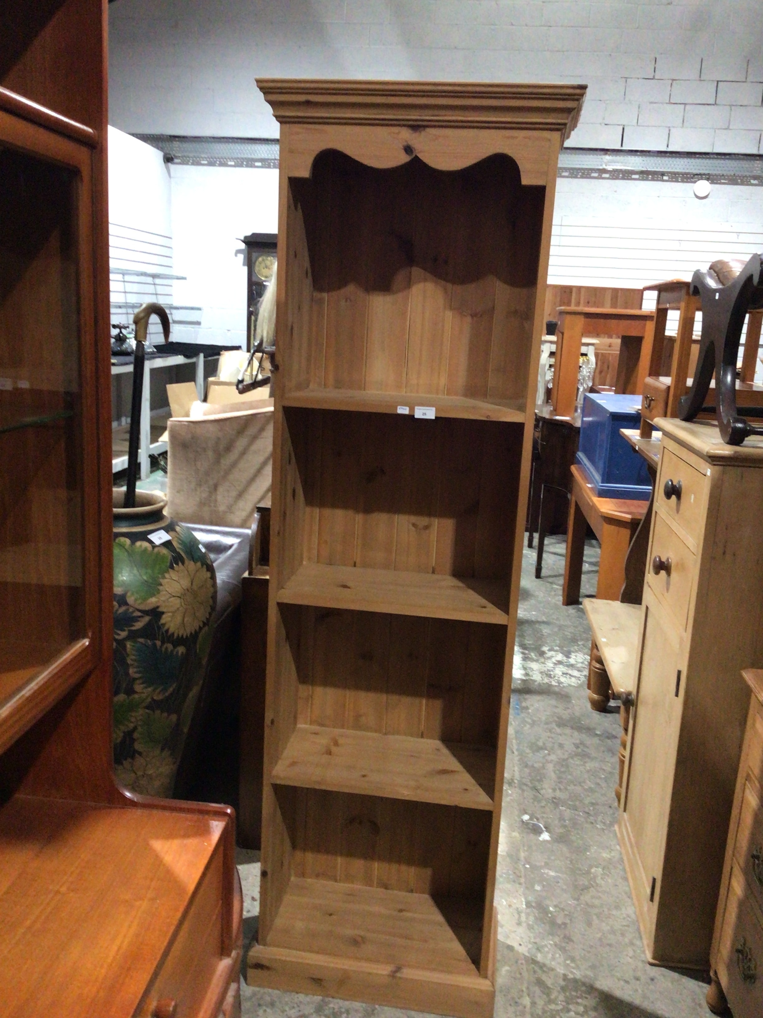 A tall, light brown pine bookshelf with a decorative scalloped top and four shelves.