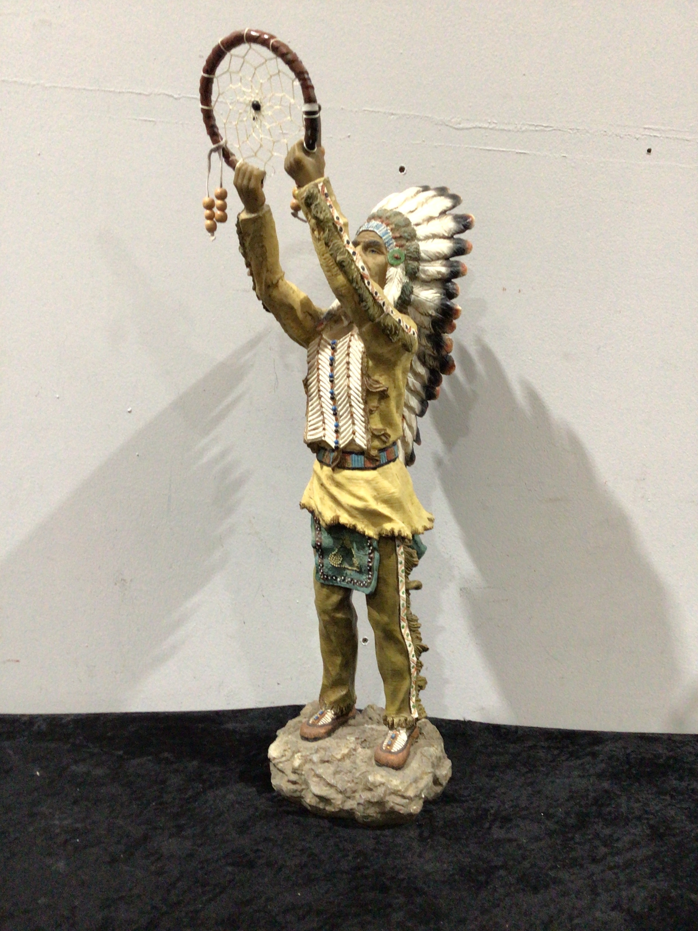 A Native American-inspired figurine, measuring approximately 62 cm high, depicts a figure wearing a feathered headdress and holding a dreamcatcher, in shades of tan, brown, white, black, red, and blue.