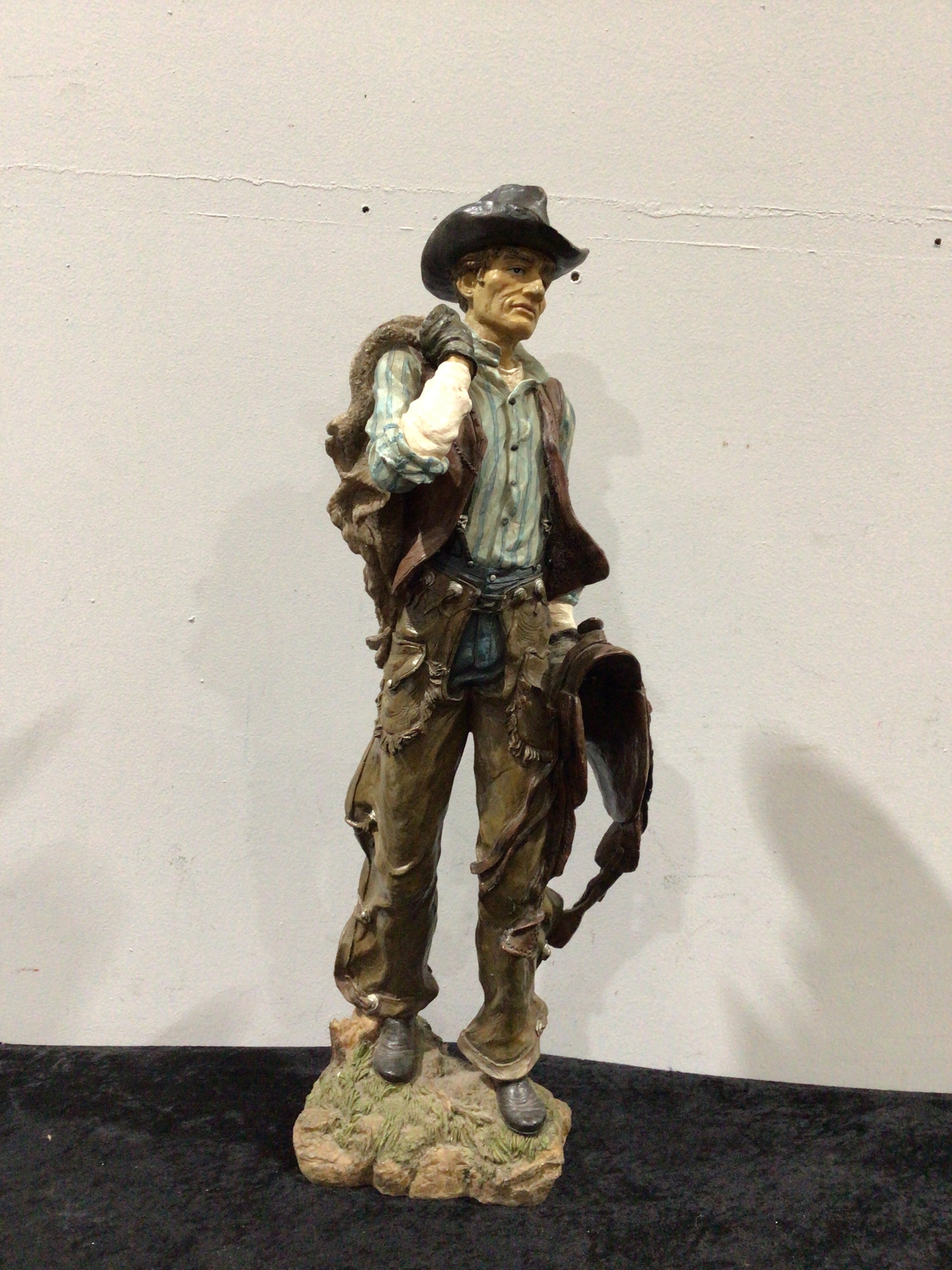 A resin cowboy figurine, primarily brown with a blue and white striped shirt, black hat and boots, and a green and brown base.