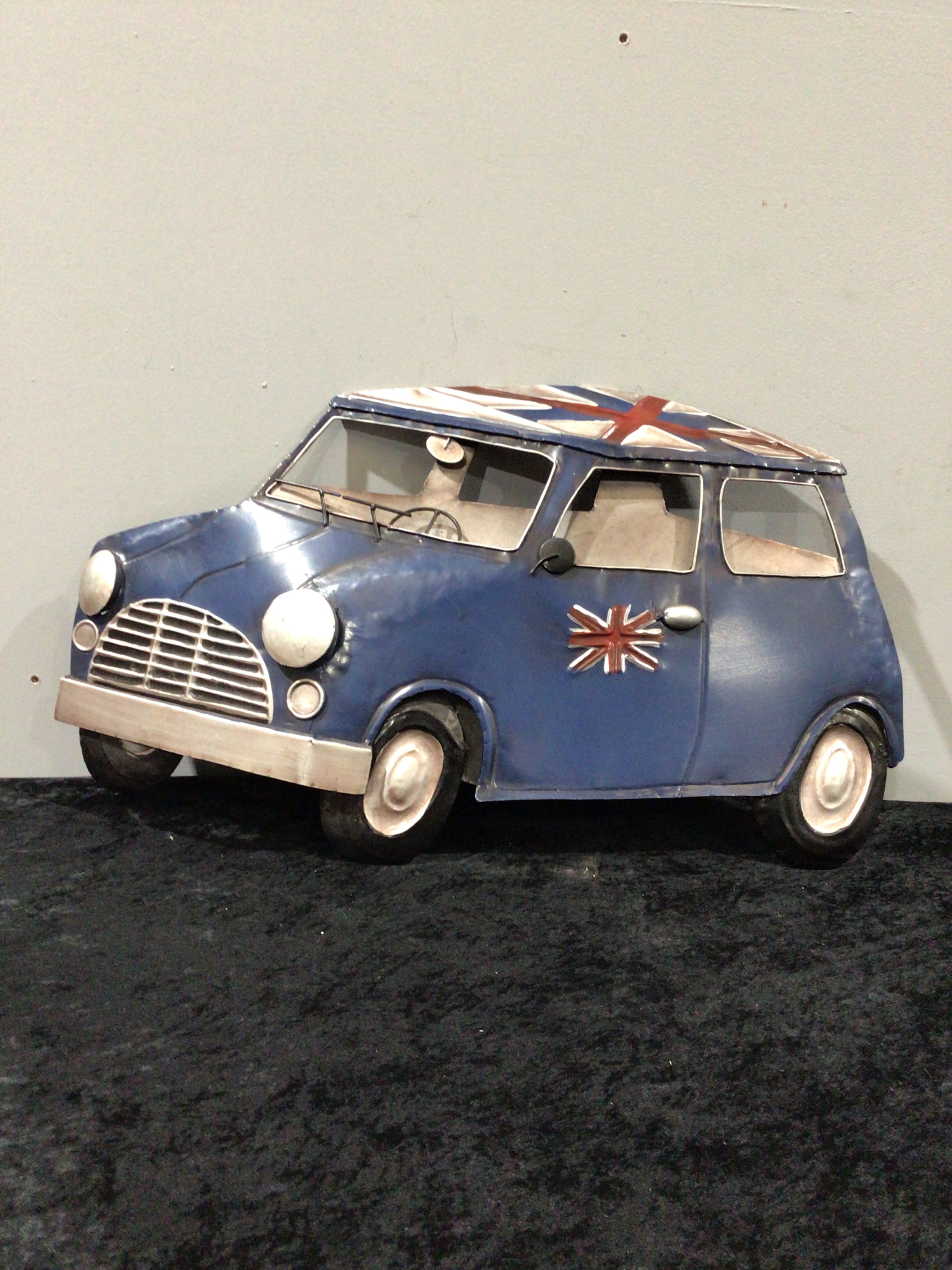 A blue decorative metal car, resembling a Mini Cooper, features a Union Jack flag design in red, white, and blue on its roof and a smaller Union Jack on the driver’s side door.