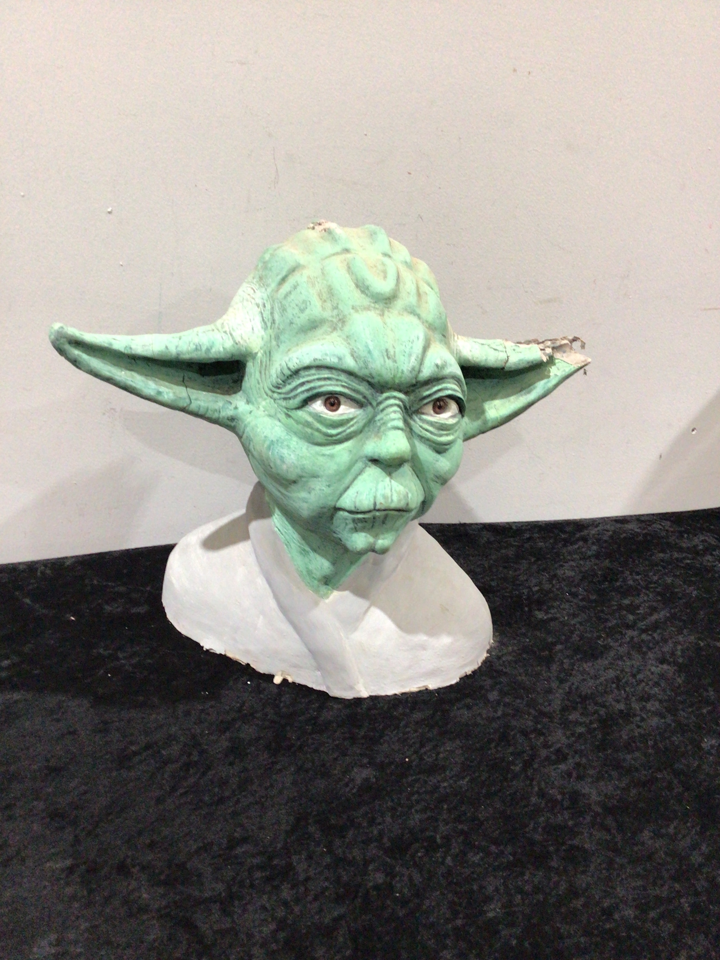 A light green and white bust sculpture depicting the Star Wars character Yoda.