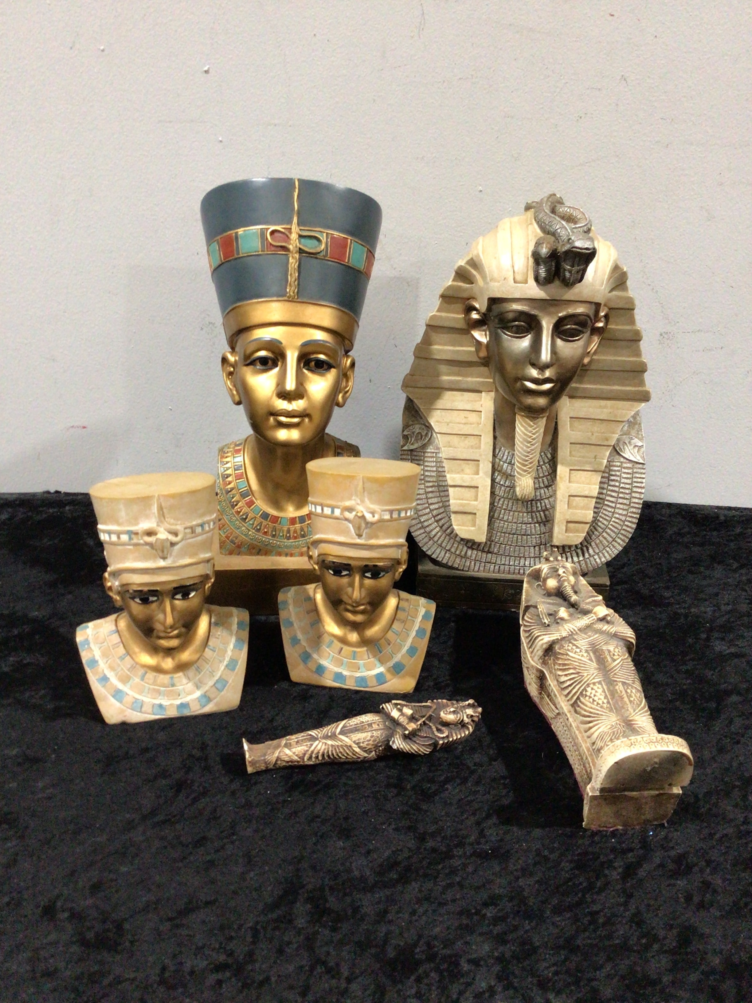 This lot comprises six Egyptian-themed decorative items: one large Nefertiti bust with a blue, gold, and multi-colored crown, one large pharaoh bust in beige, gold, and silver, two smaller pharaoh busts in gold and beige with blue and gold accents, one gold-toned decorative staff/scepter head, and one beige sarcophagus figure, with no visible labels, maker’s marks, inscriptions, brand names, or pricing.