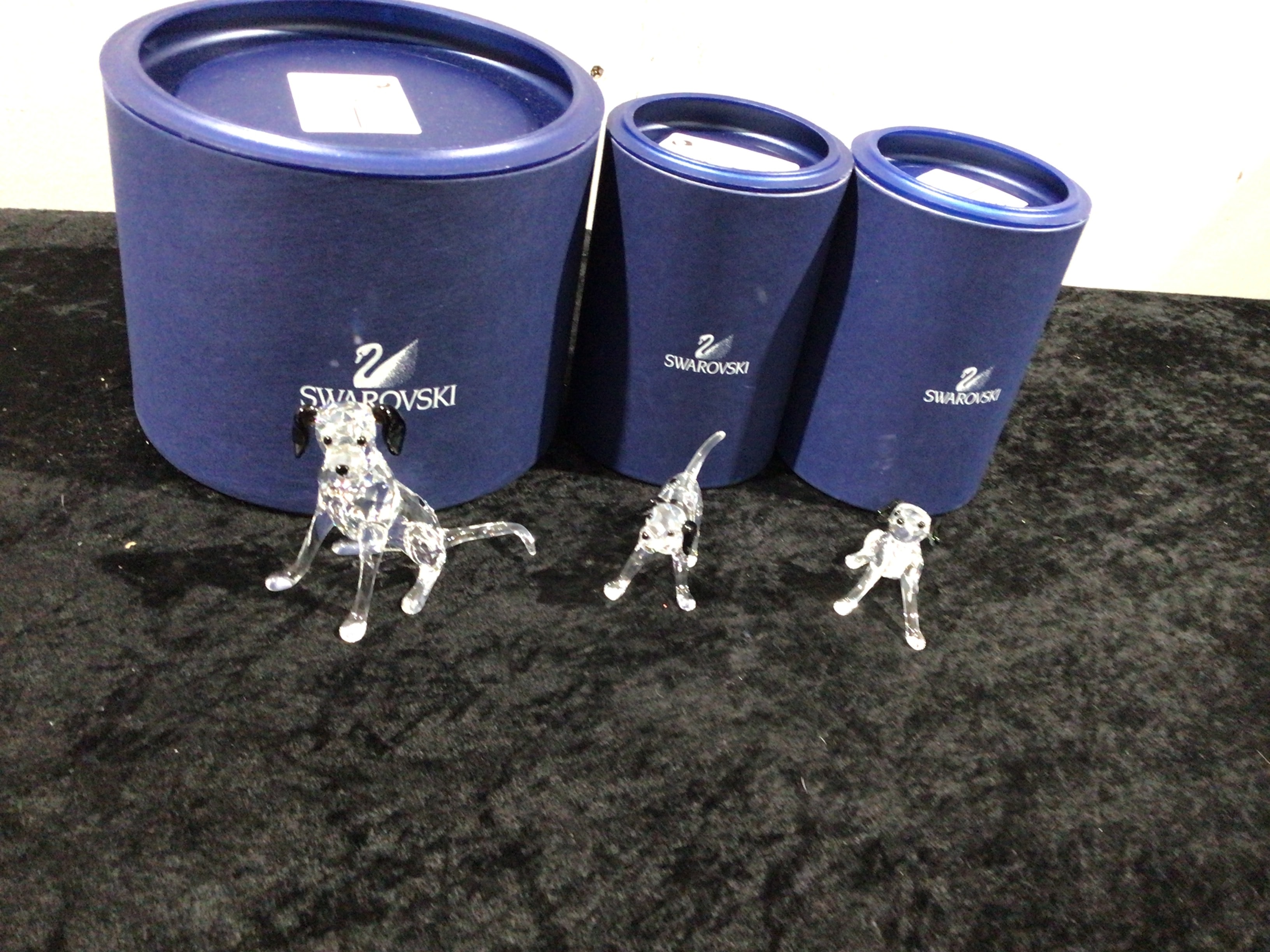 Three transparent crystal dog figurines with black accents, depicting a Dalmatian family (mother and two puppies), accompanied by three dark blue cylindrical Swarovski boxes.