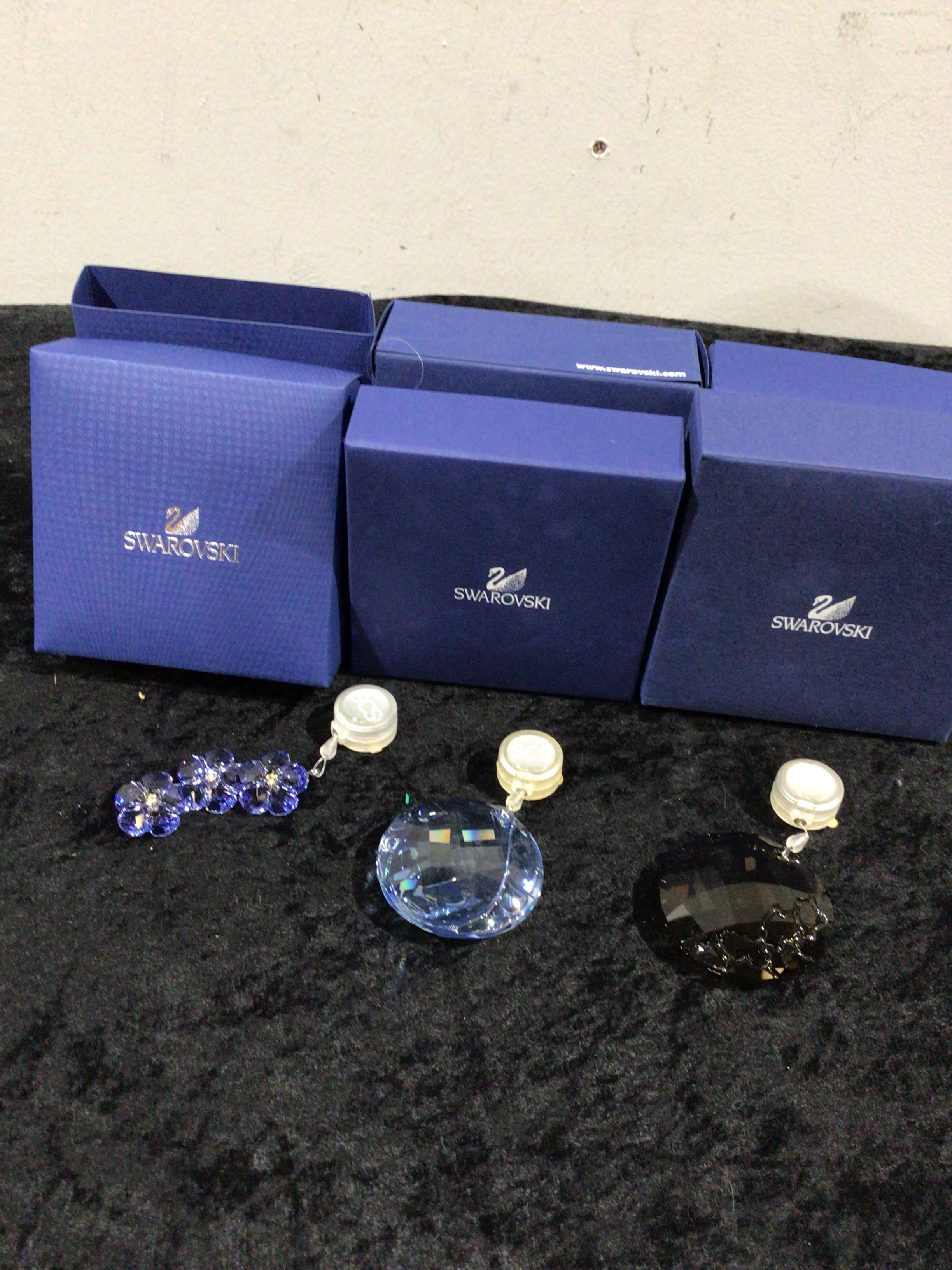 Three dark blue Swarovski boxes accompany three crystal ornaments: one string of four purple flower-shaped crystals, one large round light blue faceted crystal, and one large dark faceted crystal.