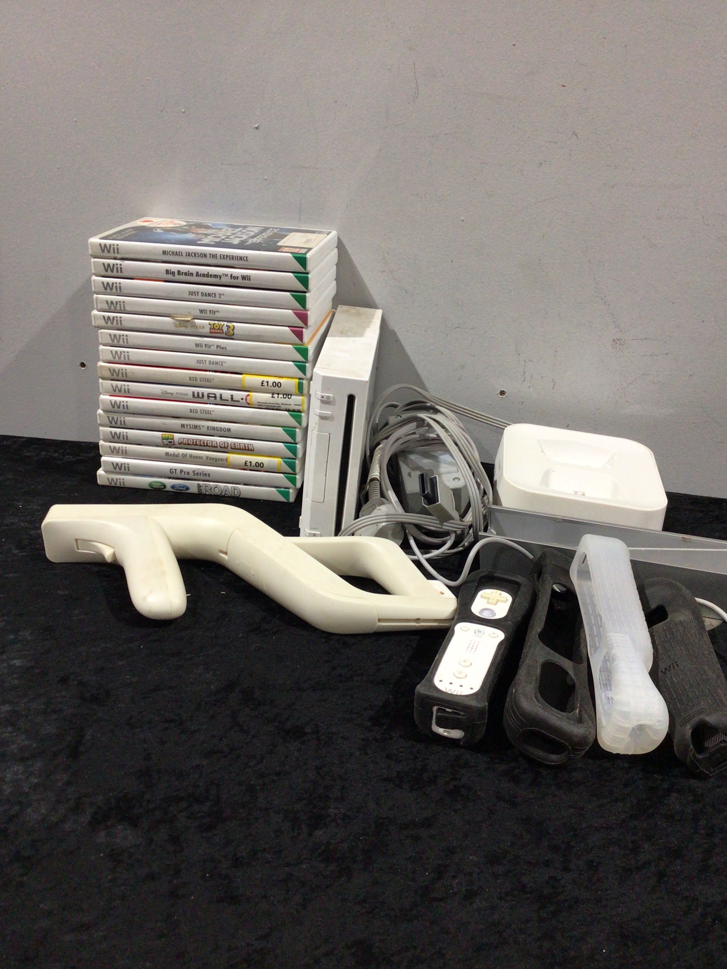 A white Nintendo Wii console, approximately 16 white-spined Wii game cases including ‘MICHAEL JACKSON THE EXPERIENCE’ and ‘WALL-E’, a white gun accessory, multiple ‘Wii’ branded controllers, nunchuks, cables, and a white charging dock.