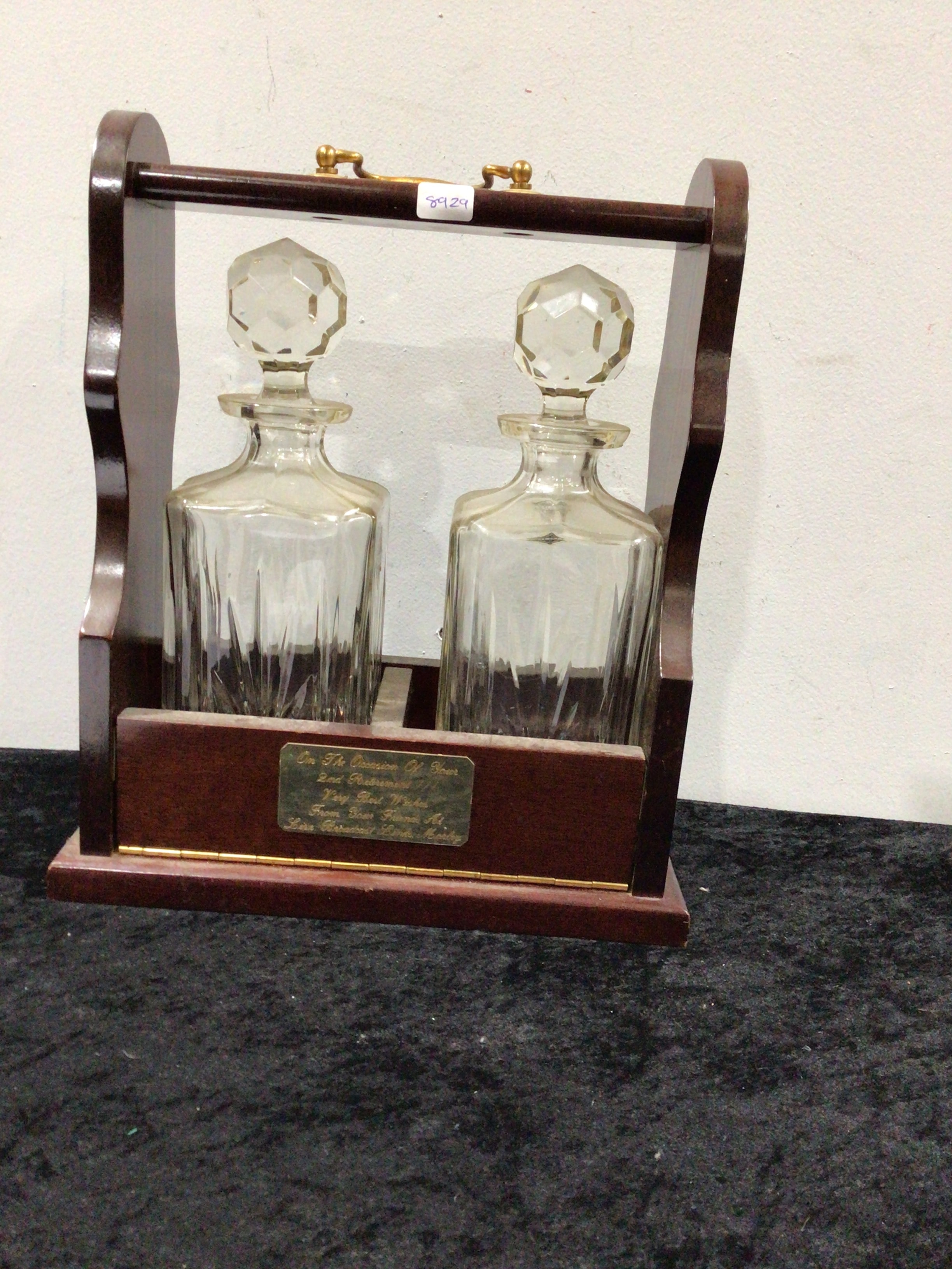 An oak tantalus with brass-colored fittings holds two clear glass decanters with faceted stoppers.