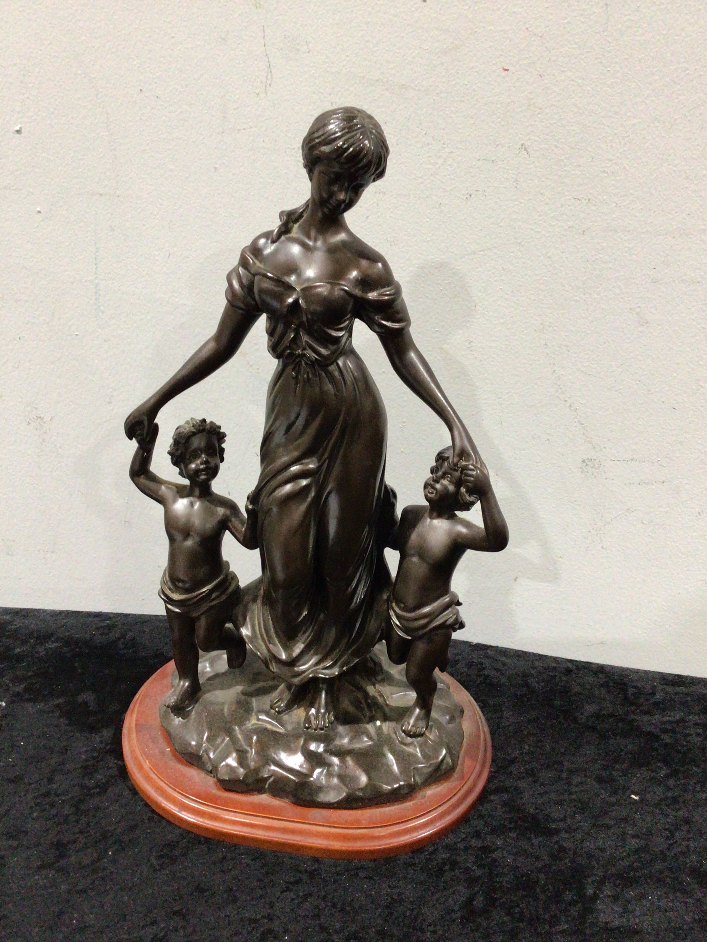 A single dark brown/bronze Style sculpture depicts a woman standing with two children, all on a reddish-brown circular wooden base.