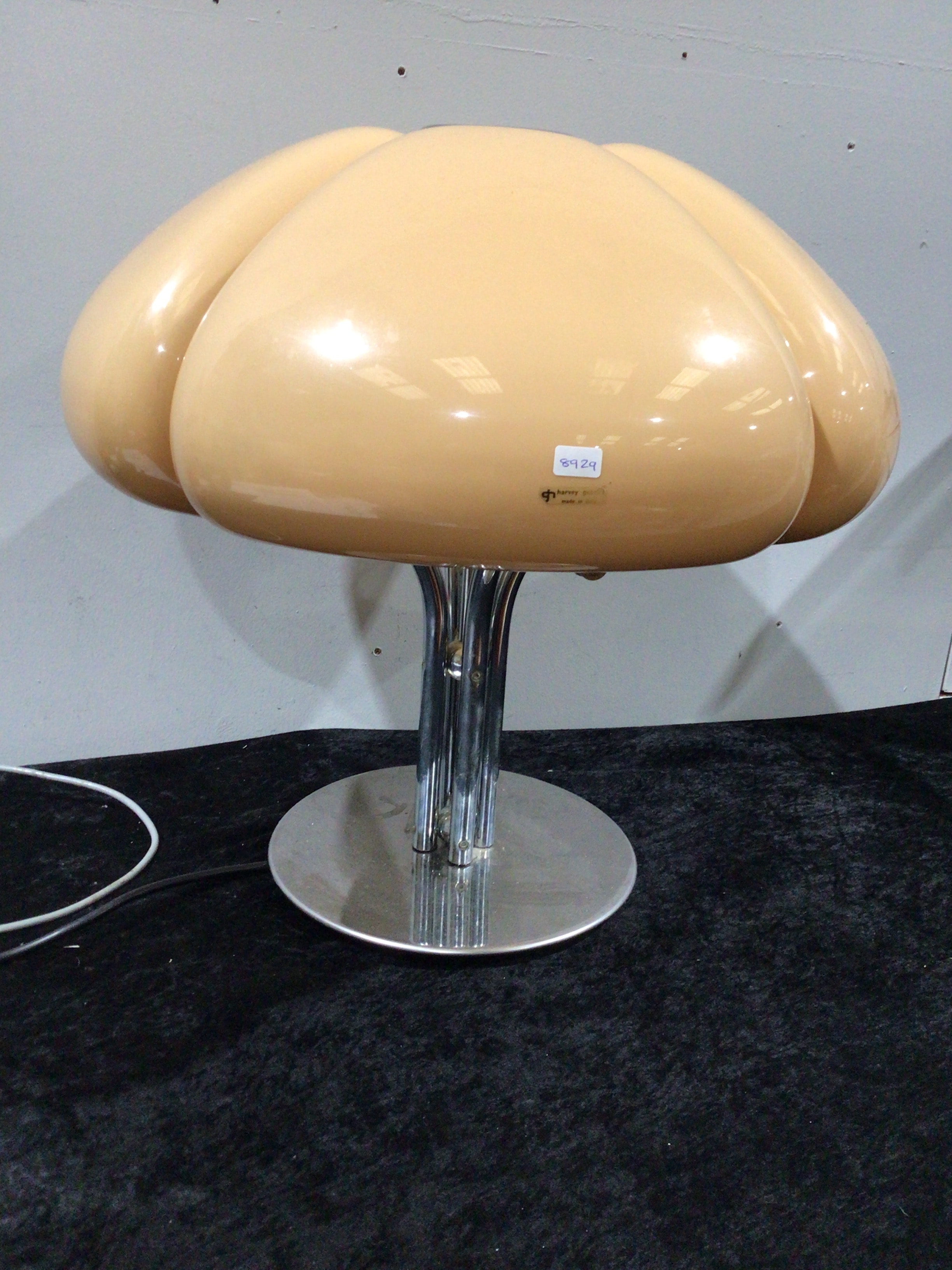 A beige and chrome table lamp with a mushroom-shaped shade and chrome base, labeled ‘harvey guzzini’ and ‘made in italy’.