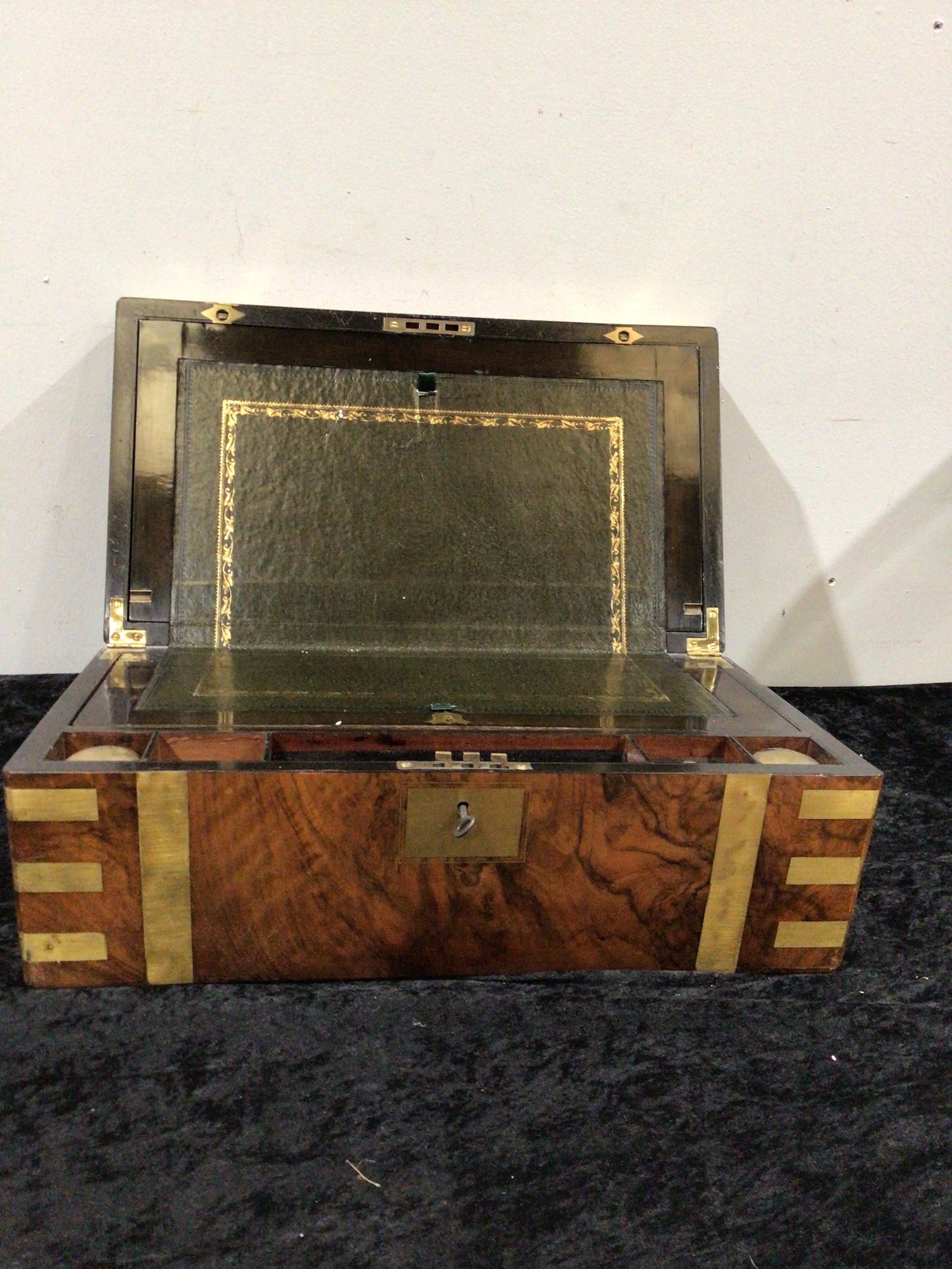 A brown wooden writing slope or campaign desk box, identified as Victorian burr walnut, with gold-colored brass strapping and fittings, and a dark green interior surface.
