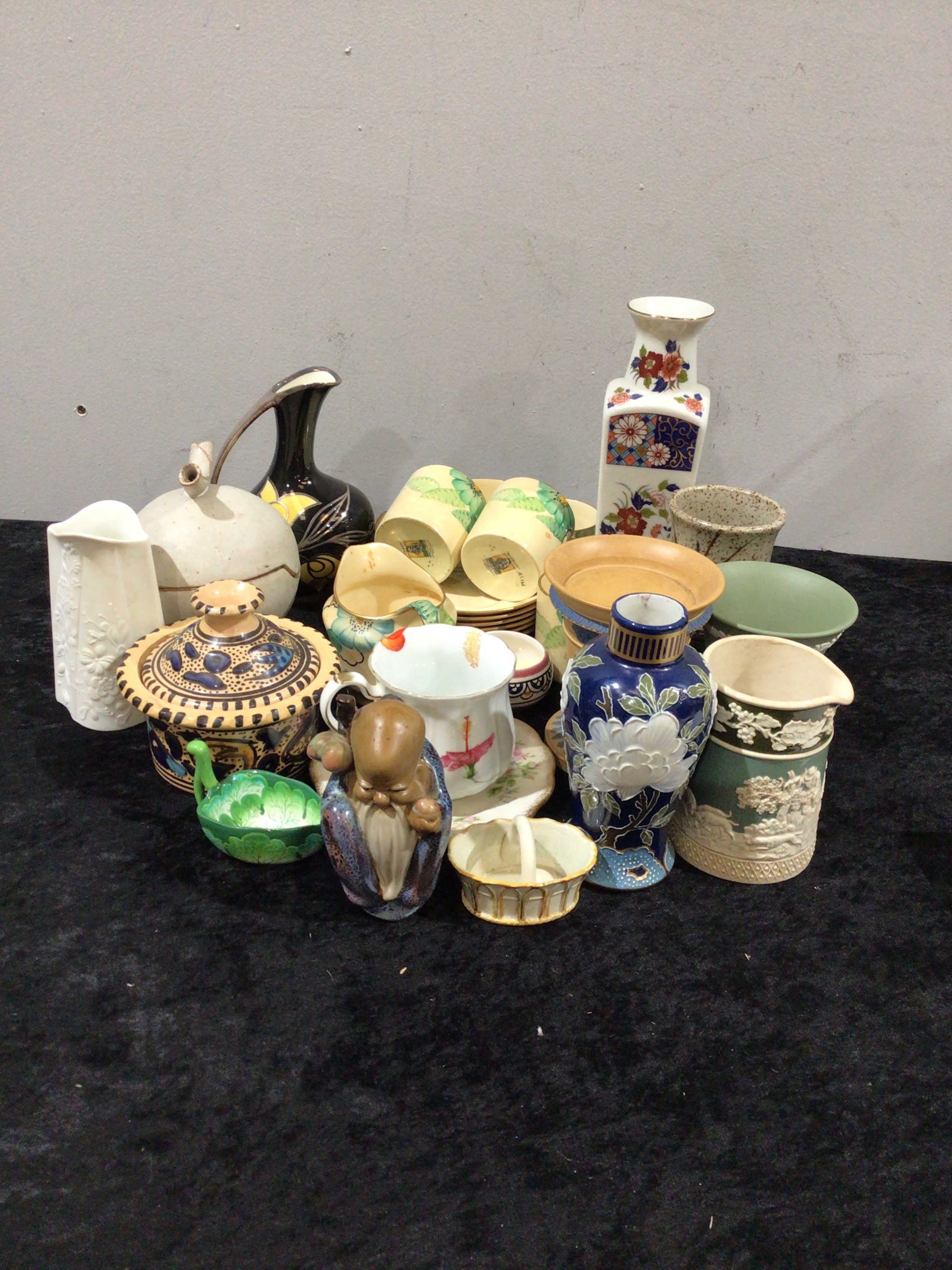 A collection of assorted ceramic and porcelain decorative wares, including vases, pitchers, bowls, and a figurine.