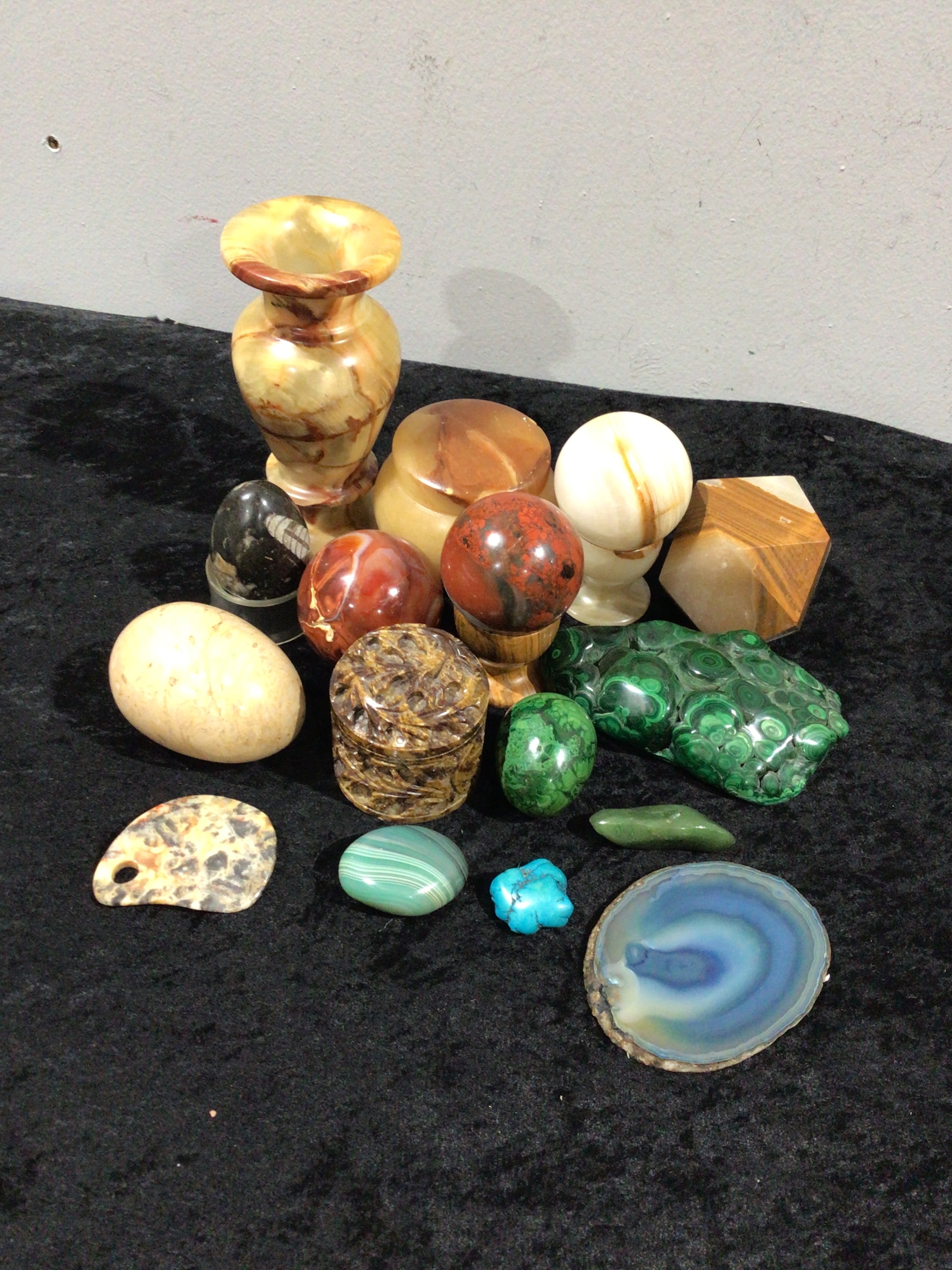 A collection of various polished stone objects including eggs, spheres, a vase, and natural specimens in assorted colors and shapes.