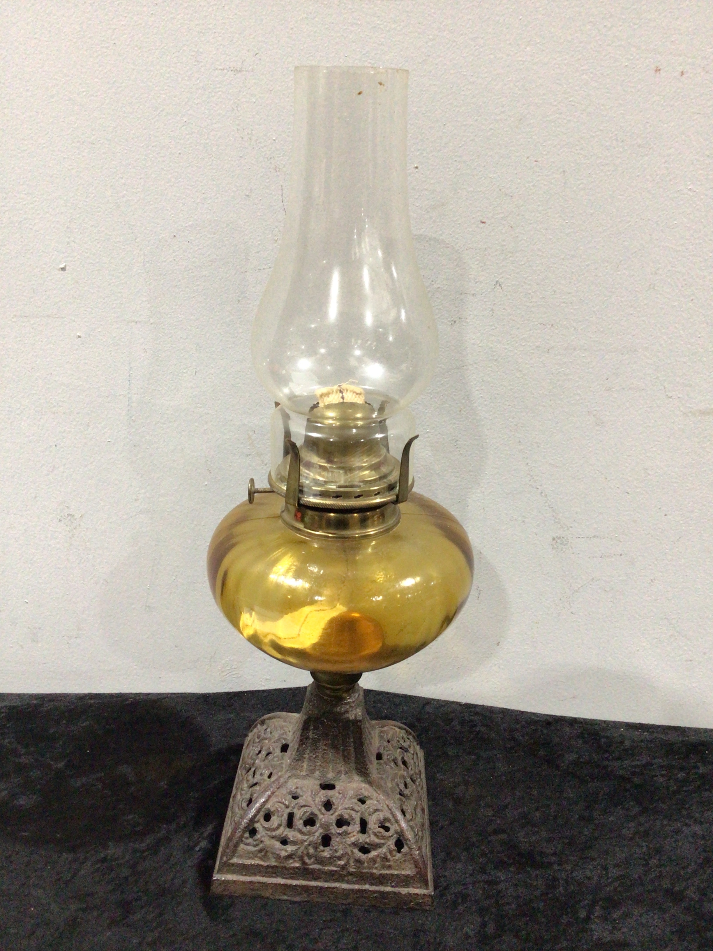 An oil lamp features a clear glass chimney, a brass-colored burner, an amber glass fuel reservoir, and a dark, ornate cast iron base.