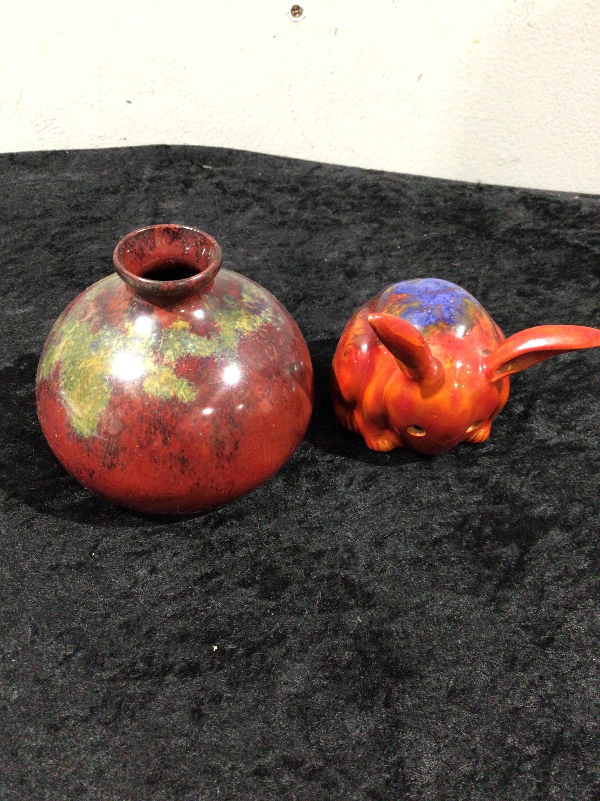 A round, multi-hued ceramic vase in speckled red, green, gold, and blue, bearing stylized characters on its base, and an abstract red and orange ceramic lidded container shaped like an animal, with blue and purple accents, marked ‘BM’ inside its base.