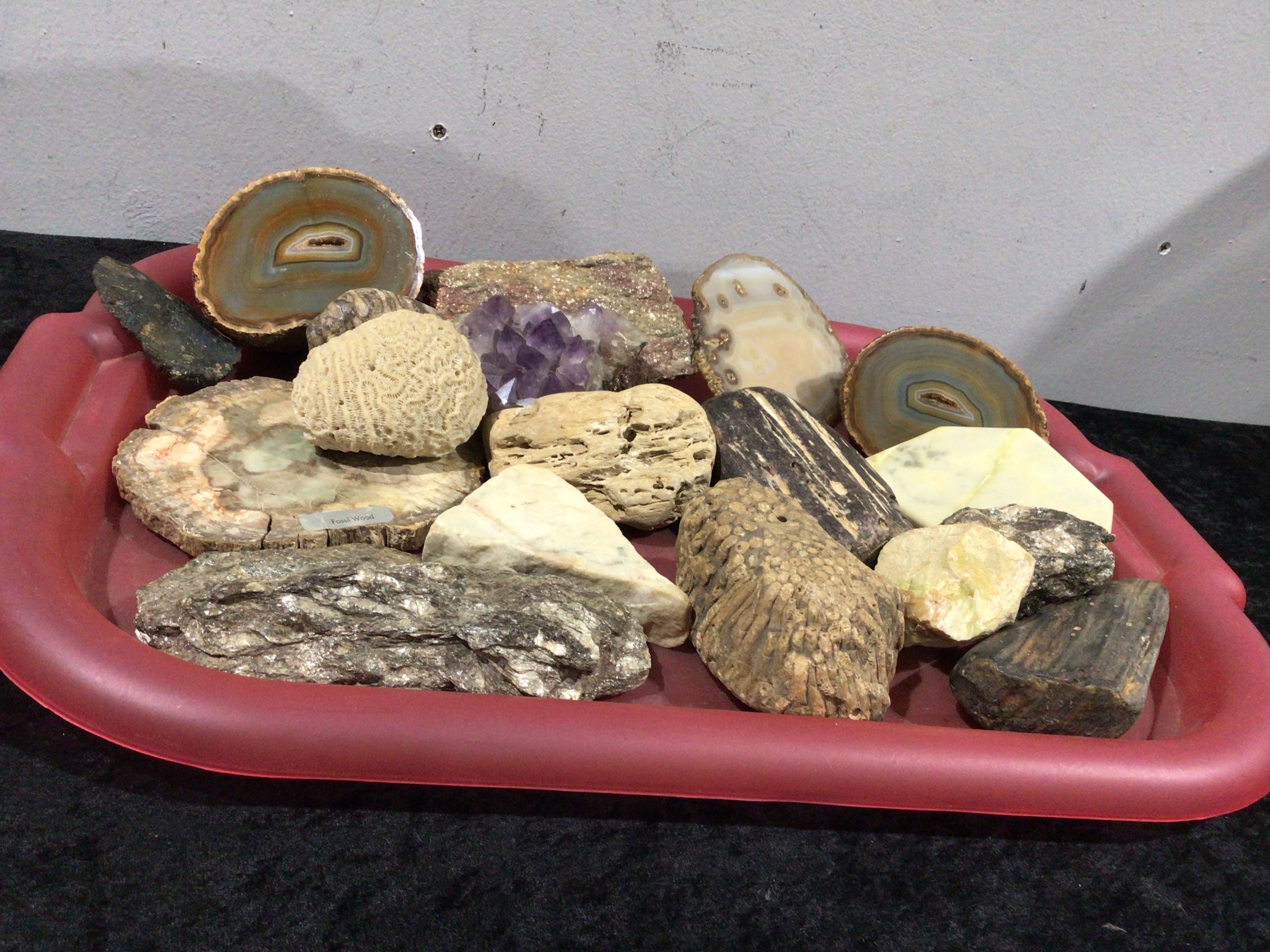 A collection of approximately 18-20 natural specimens, including polished banded agate slices, rough minerals, purple amethyst crystals, petrified wood, and fossilized coral, displaying a variety of earthy tones.