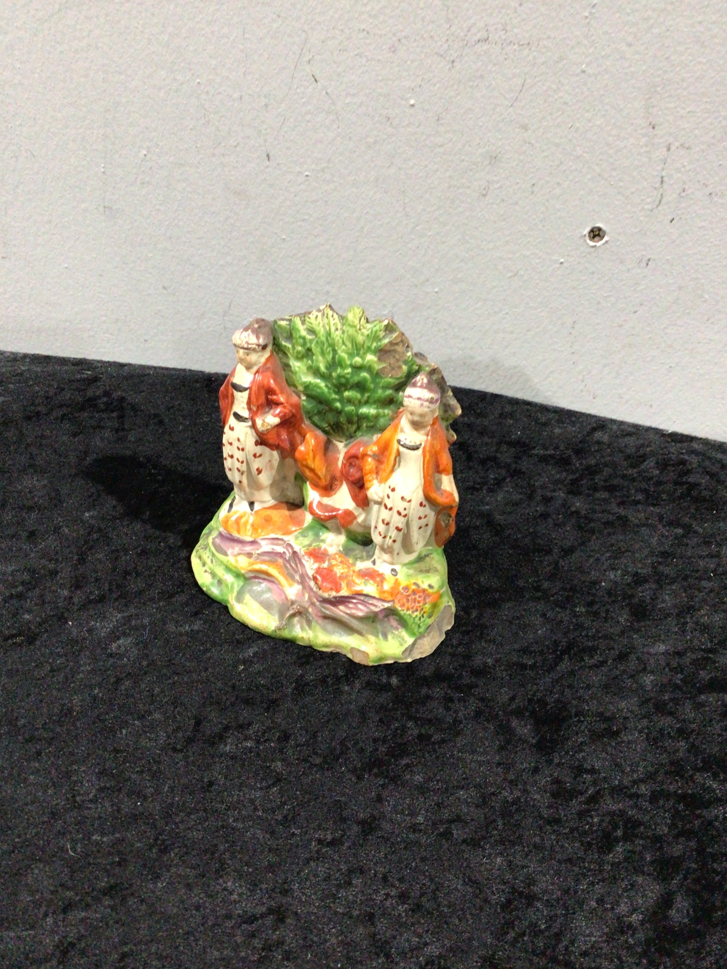 A single polychrome ceramic figurine depicts two figures in orange and white attire standing next to green foliage on a colorful base.