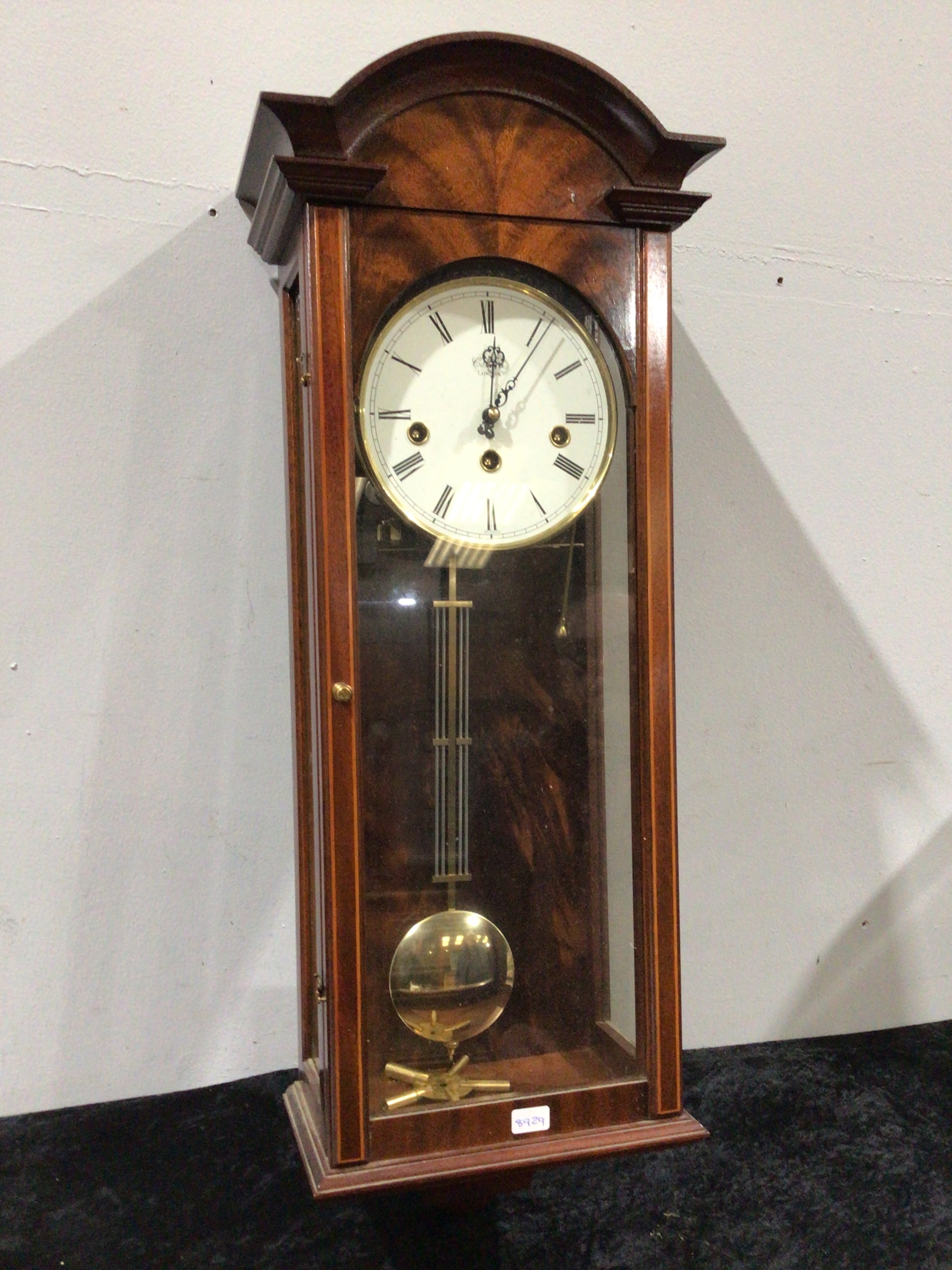 A dark brown wooden wall clock with a white face displaying Roman numerals, inscribed “GARRARD LONDON” with a crown emblem, and featuring a brass pendulum and weights.