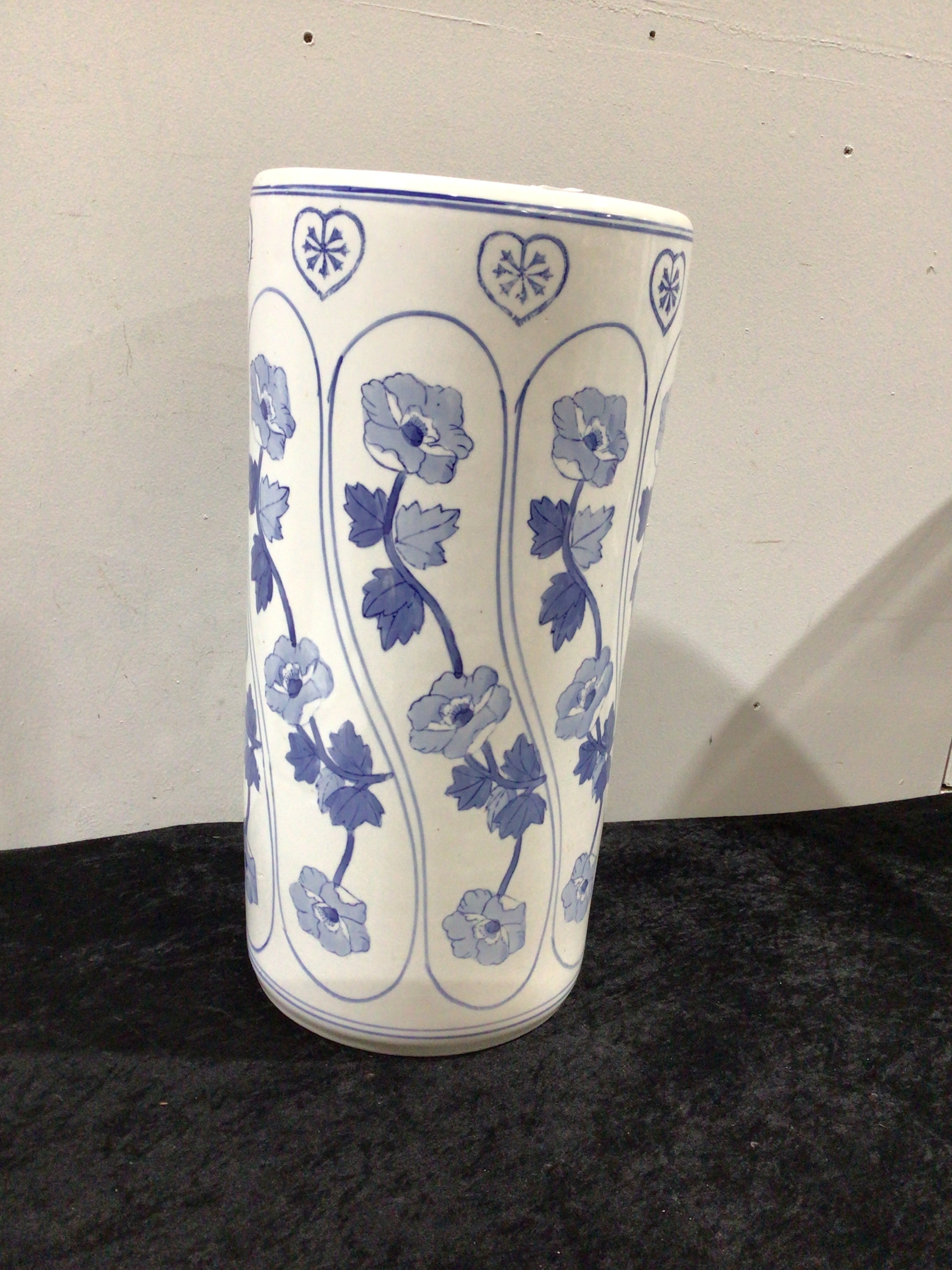 A white ceramic umbrella stand decorated with blue floral designs and heart-shaped motifs at the top.