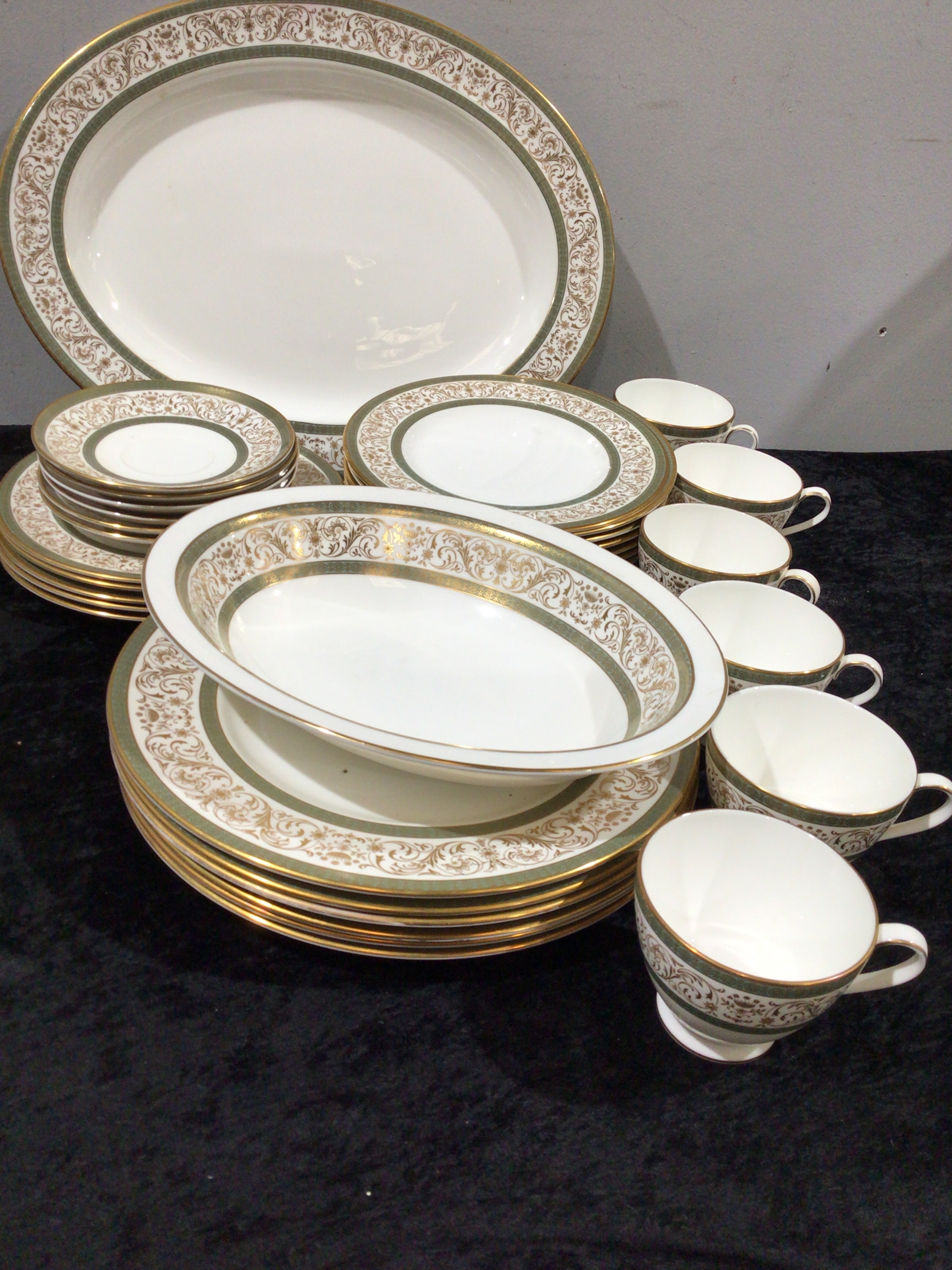 A large white porcelain dinnerware set with green and gold decorative borders, including numerous plates, cups, platters, and serving dishes, bearing the mark “ARAGON MINTON EST. 1793 BONE CHINA MADE IN ENGLAND COPYRIGHT MINTON LIMITED”.