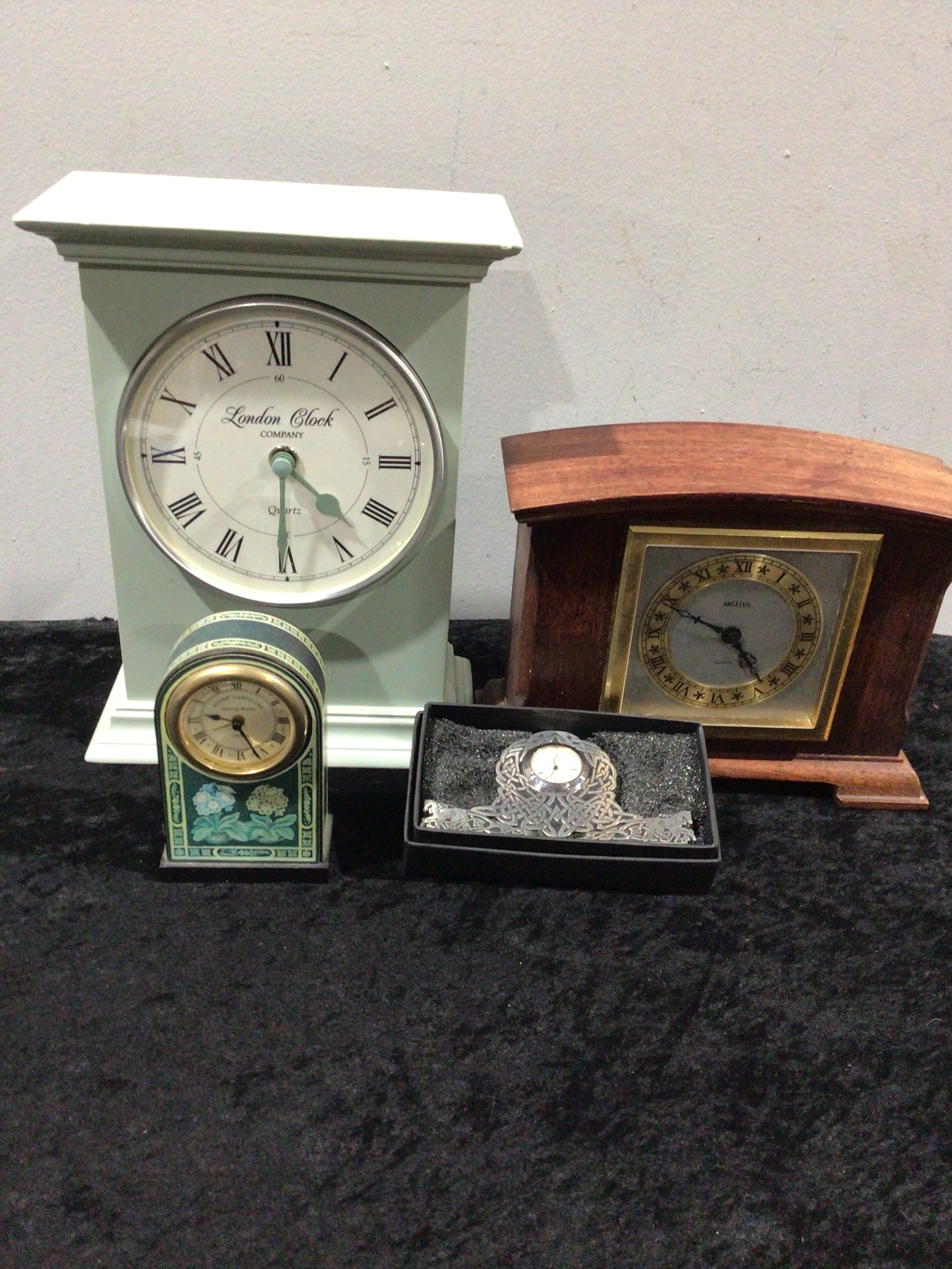 A collection of four clocks including a light green London Clock Company Quartz mantel clock, a small dark green Roger Lascellen London Quartz Alarm floral desk clock, a brown wooden Angelus Quartz mantel clock, and a silver-colored Celtic knot-design clock with a horse head in a black box.