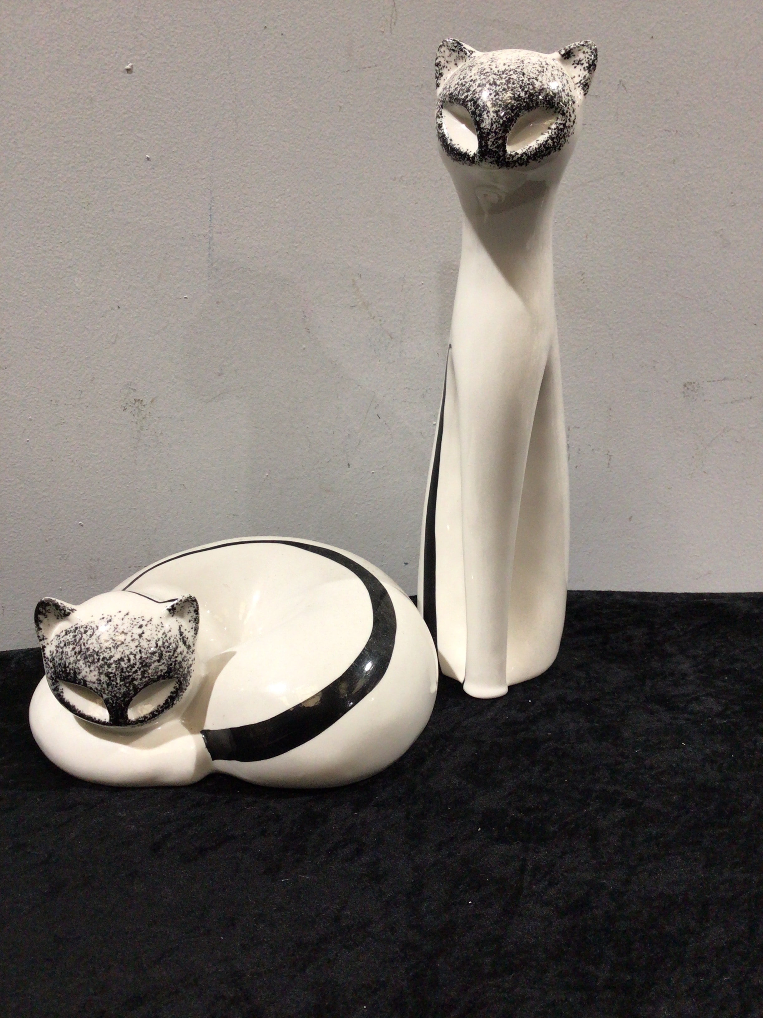 A pair of decorative cat figurines, one standing tall and one curled up, both primarily white with black speckled faces and black stripe accents.