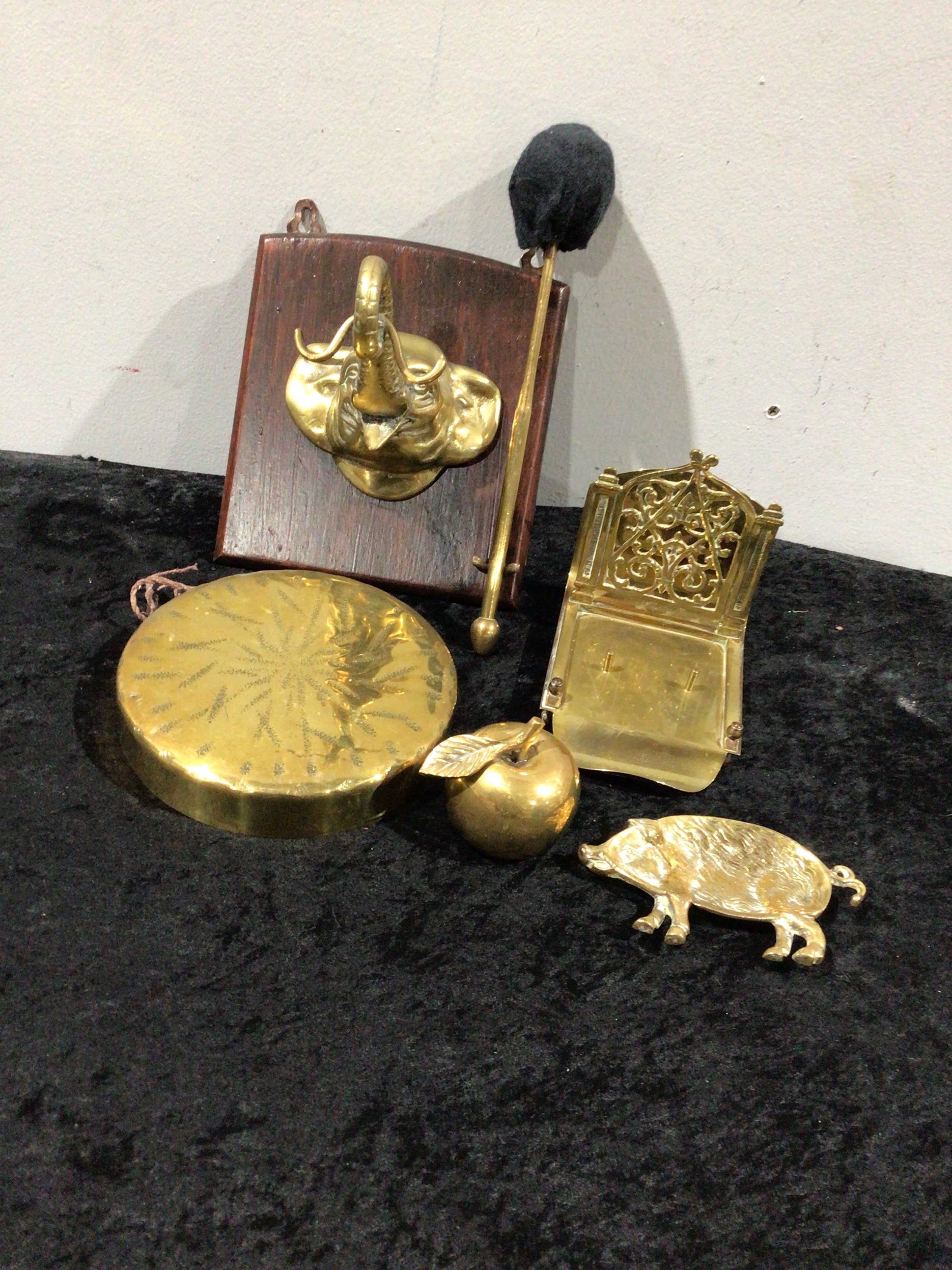 A collection including a dark brown wooden plaque with a brass elephant head door knocker and a black-tipped brass rod, a round etched brass box, an ornate brass miniature chair-like object, a brass apple figure with a leaf, and a brass pig figure.