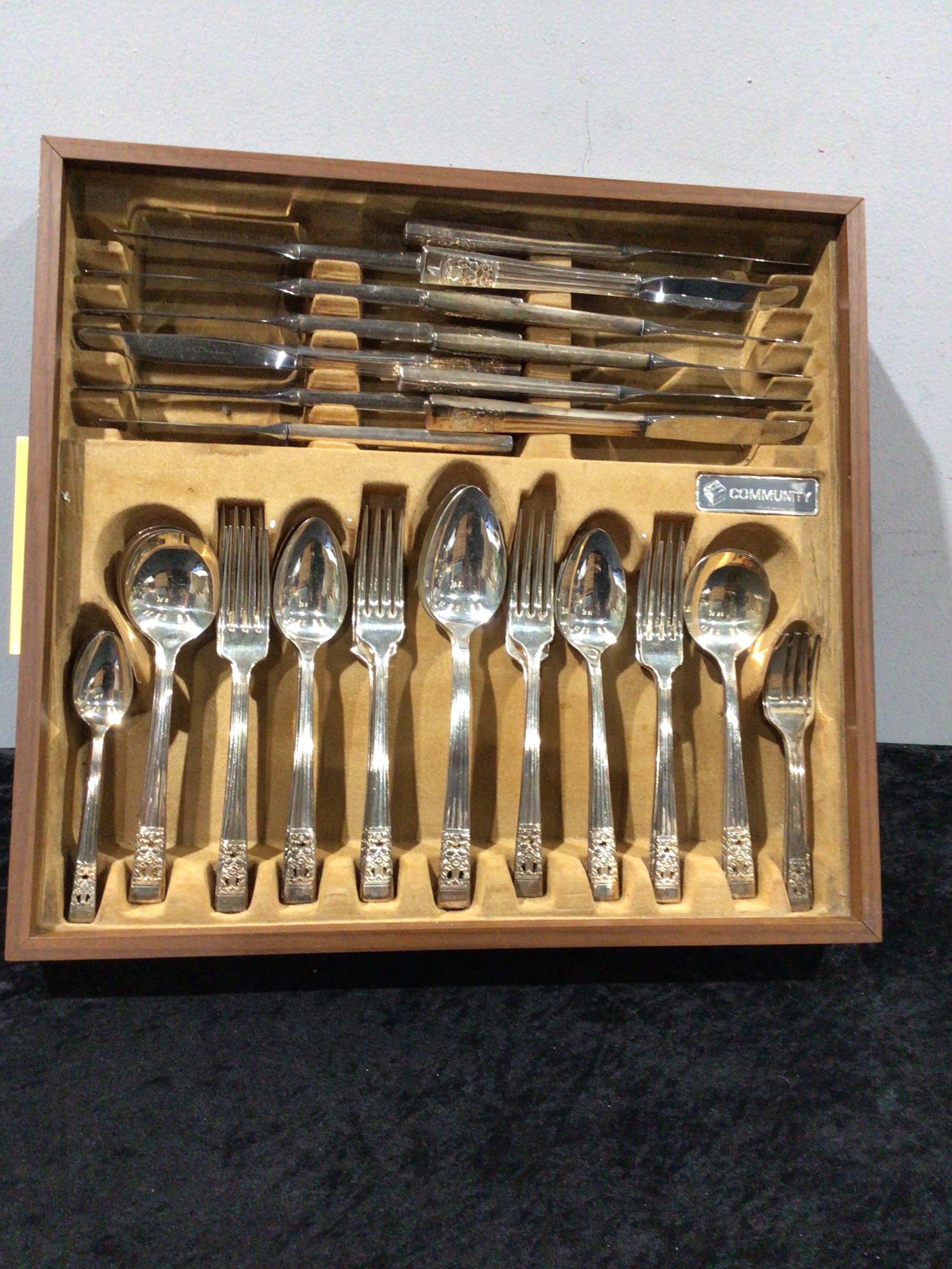 A 24-piece silver-colored flatware set, consisting of 12 knives, 6 forks, and 6 spoons, by COMMUNITY, housed in a tan felt-lined wooden box.