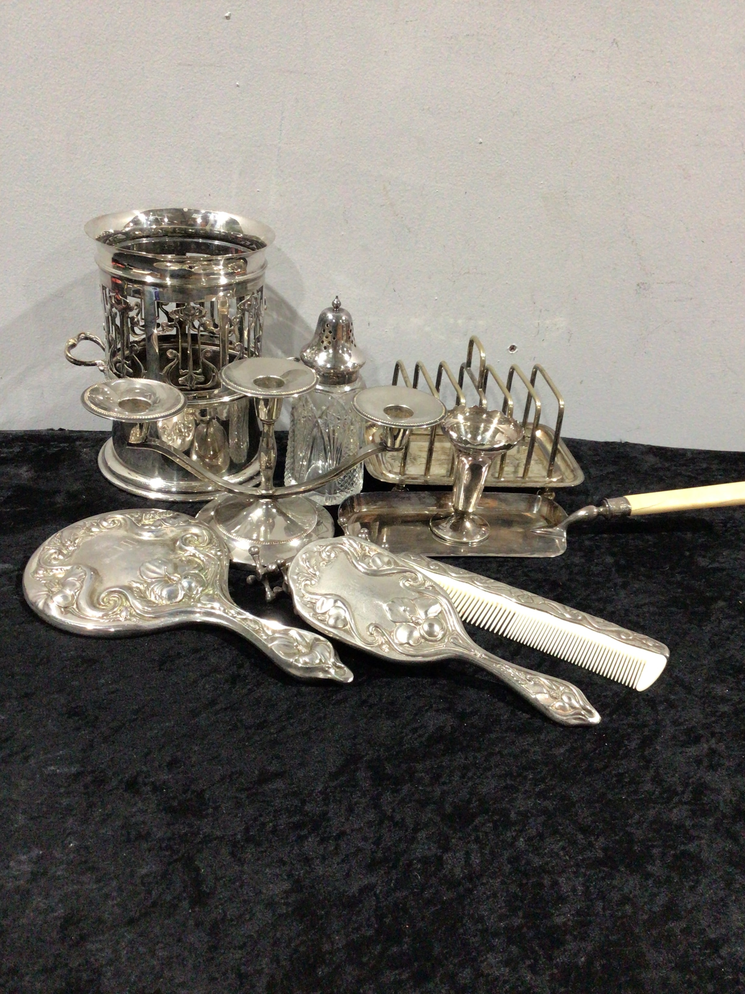A collection of silver-colored metalware includes an ornate cylindrical holder, a cruet set with a clear glass shaker and two candleholders, a toast rack, a server with a cream handle, two decorative hand mirrors, an ornate comb with white teeth, and a small domed lid.