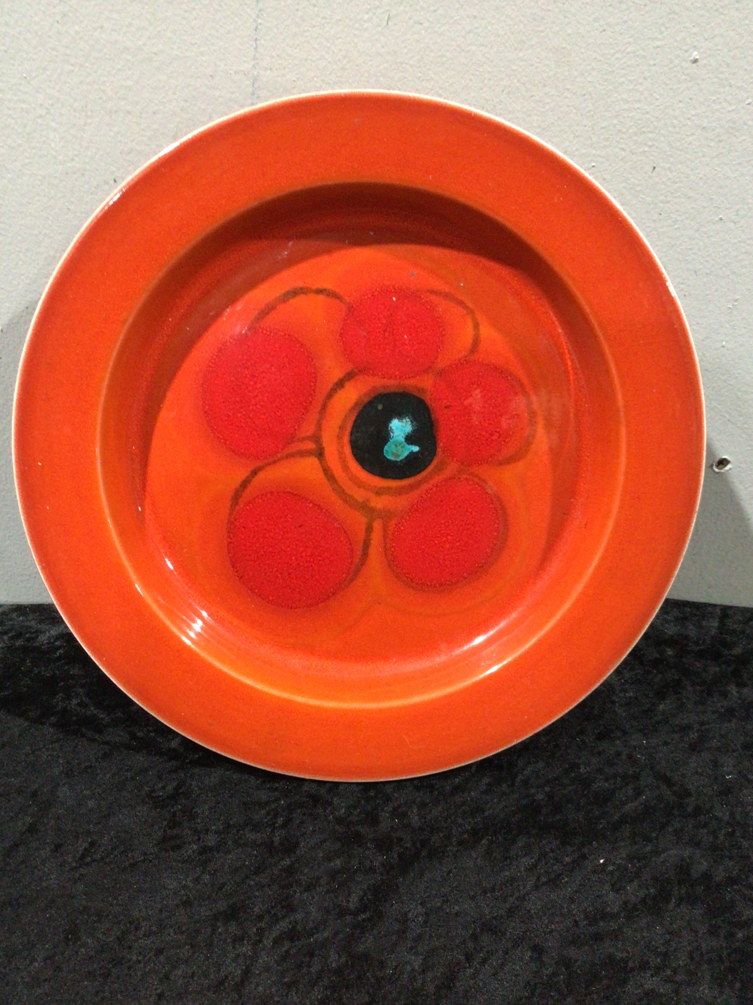 A single orange ceramic plate or shallow bowl with a red, black, and turquoise abstract floral design, marked ‘SWEDEN GA PION’ and ‘5’ with a crown symbol on the reverse.