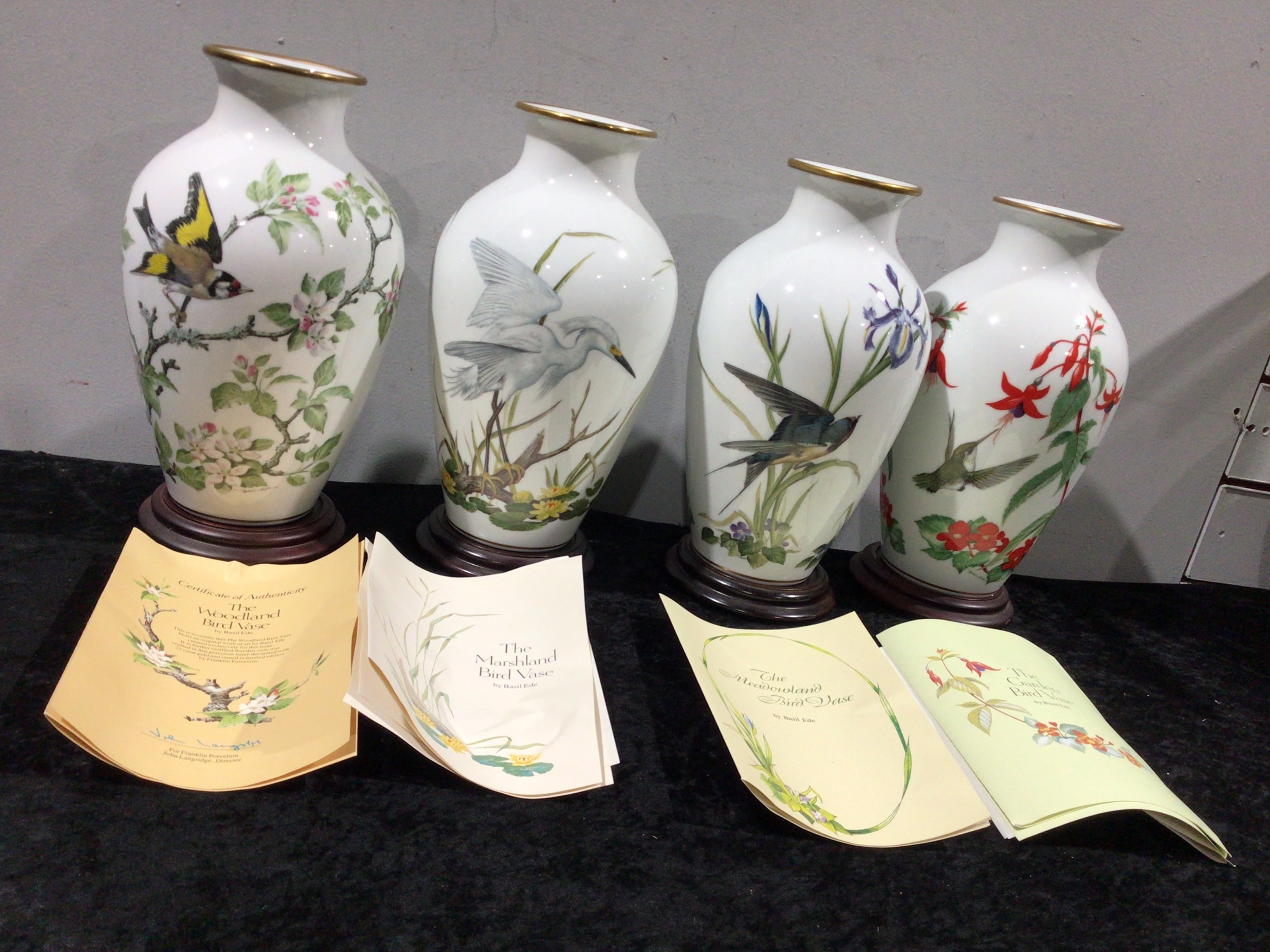 A set of four white porcelain vases by Basil Ede for Franklin Porcelain, each with gold rims, dark wooden bases, and distinct multi-colored bird and floral designs, accompanied by matching booklets.