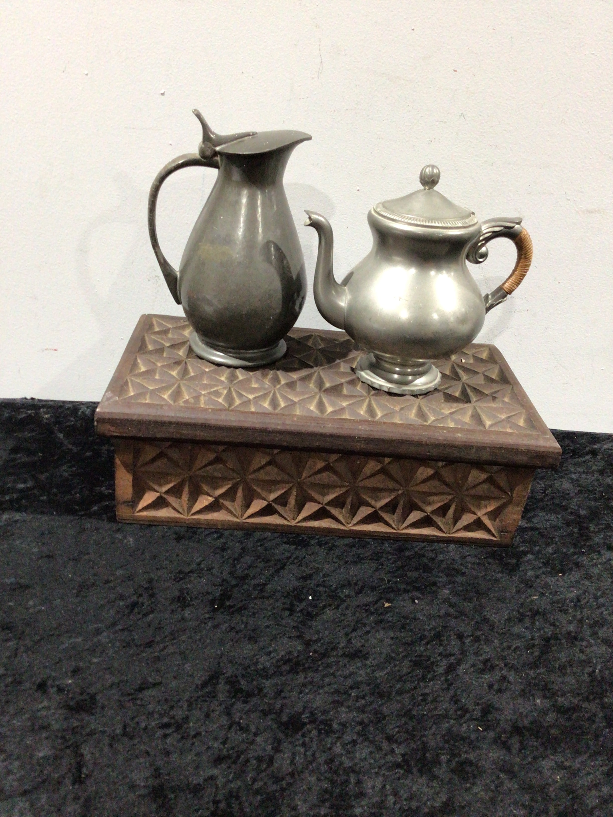 A dark gray metal pitcher, a silver-toned metal teapot with a tan wrapped handle, and a dark brown carved wooden box.