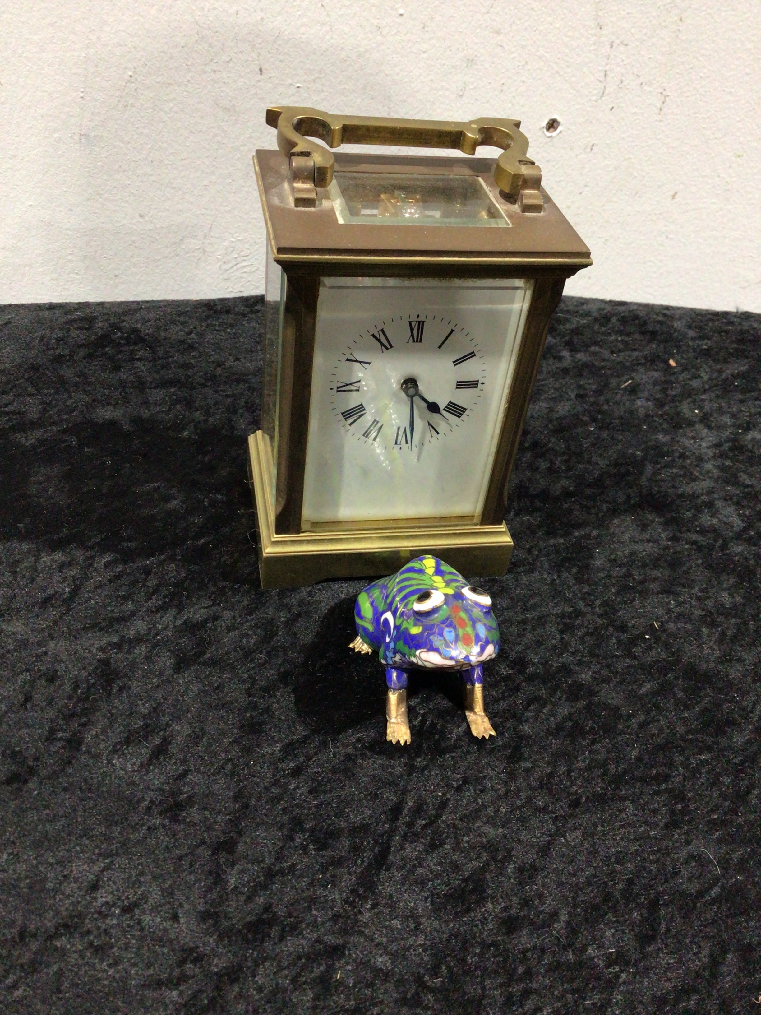 A brass carriage clock with a white face and black Roman numerals, and a cloisonné frog figurine primarily in blue, green, and yellow with gold-tone legs.