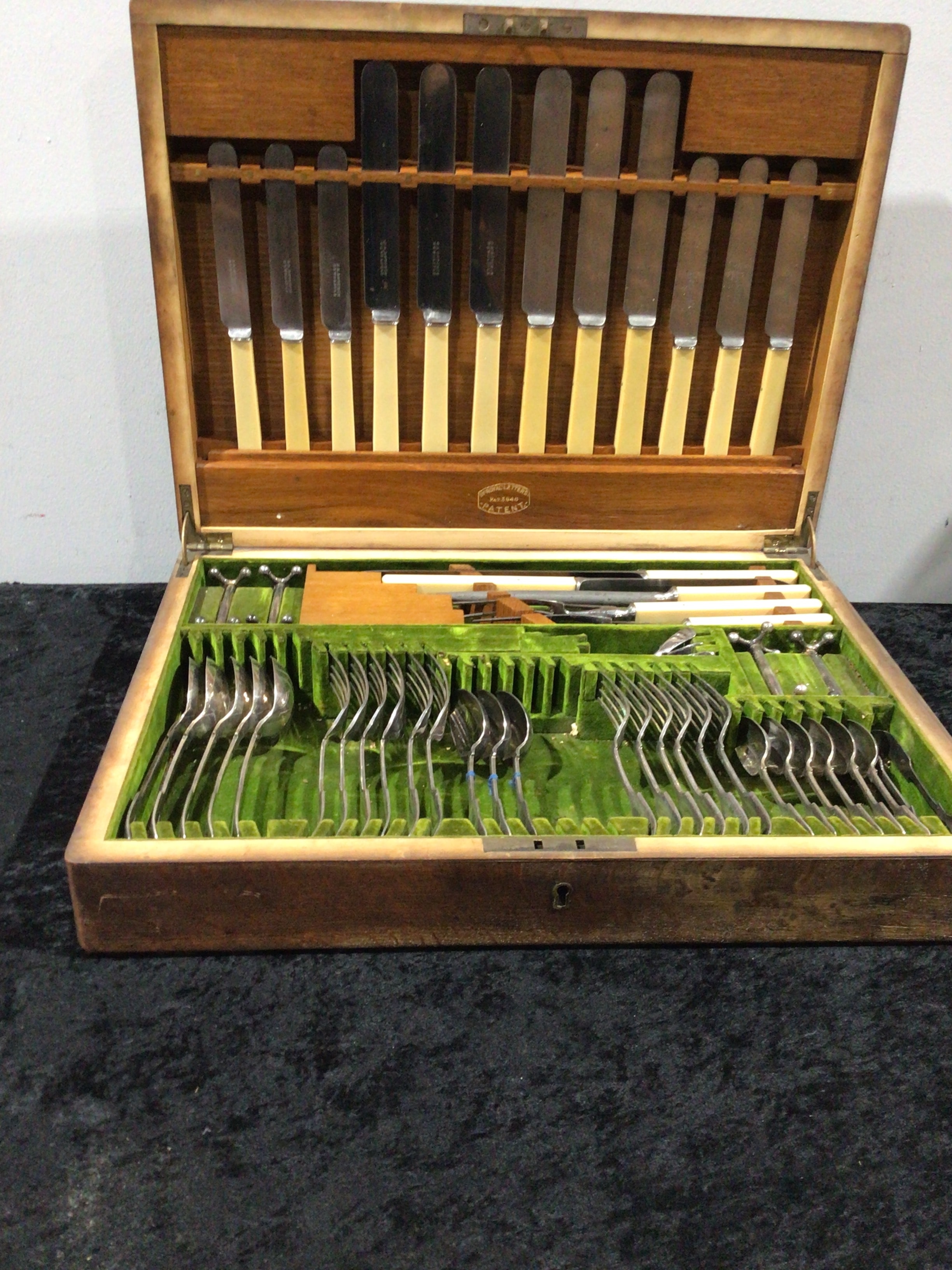 An approximately 54-piece silver-colored cutlery set by The Goldsmiths & Silversmiths Company, including 12 knives, 12 forks, 12 dinner spoons, 12 teaspoons, and several serving pieces with cream-colored handles, housed in a brown wooden case with green velvet lining, marked ‘GOLDSMITHS & SILVERSMITHS COMPANY LTD.’ and ‘PATENT VAR. 5940’ on the case, and ‘THE GOLDSMITHS & SILVERSMITHS COMPANY 112 REGENT ST. W’ on the knife blades.