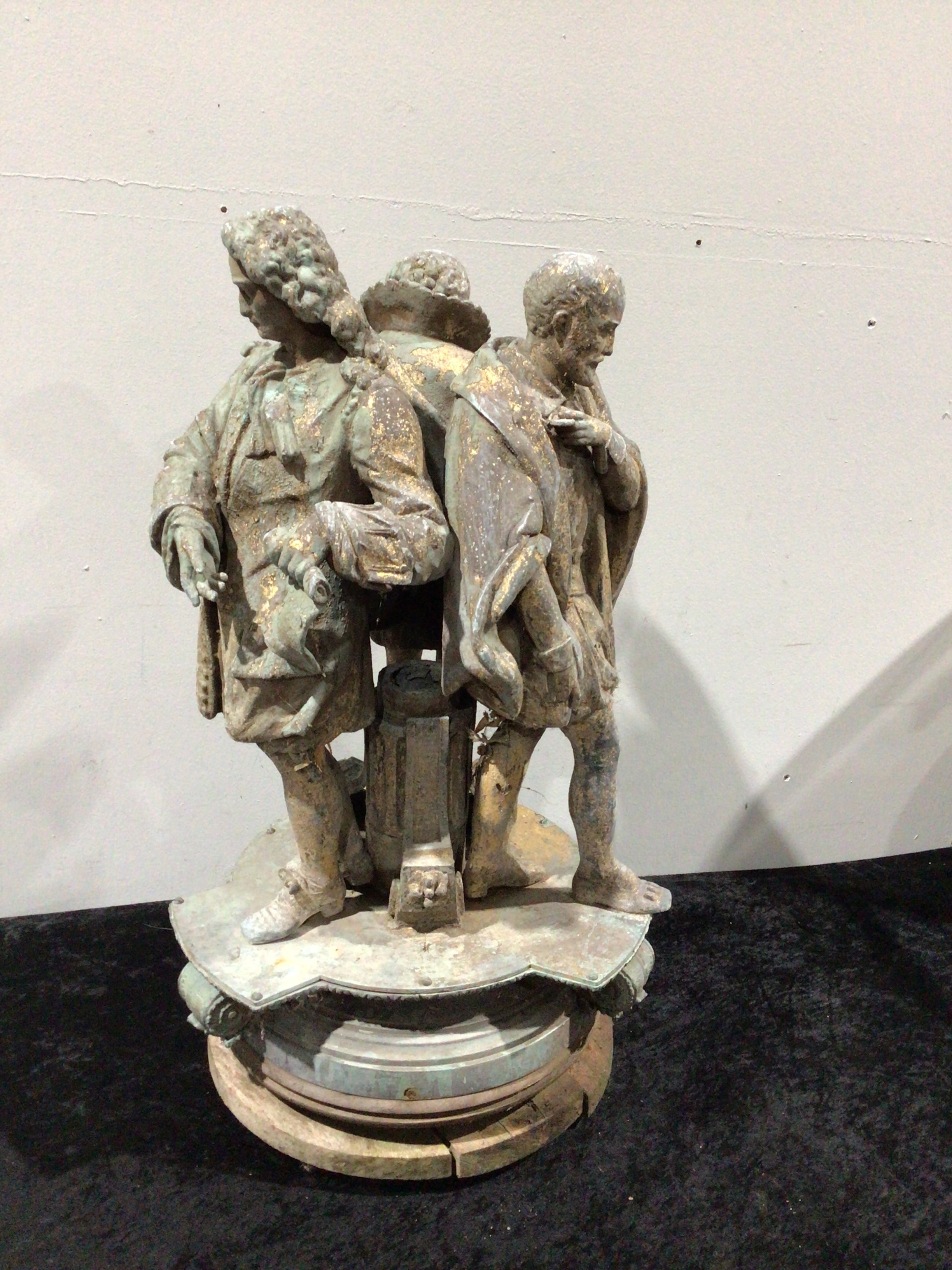 A multi-figure sculpture depicting three male figures, exhibiting a verdigris green/blue-grey patina with faded gold gilt accents.