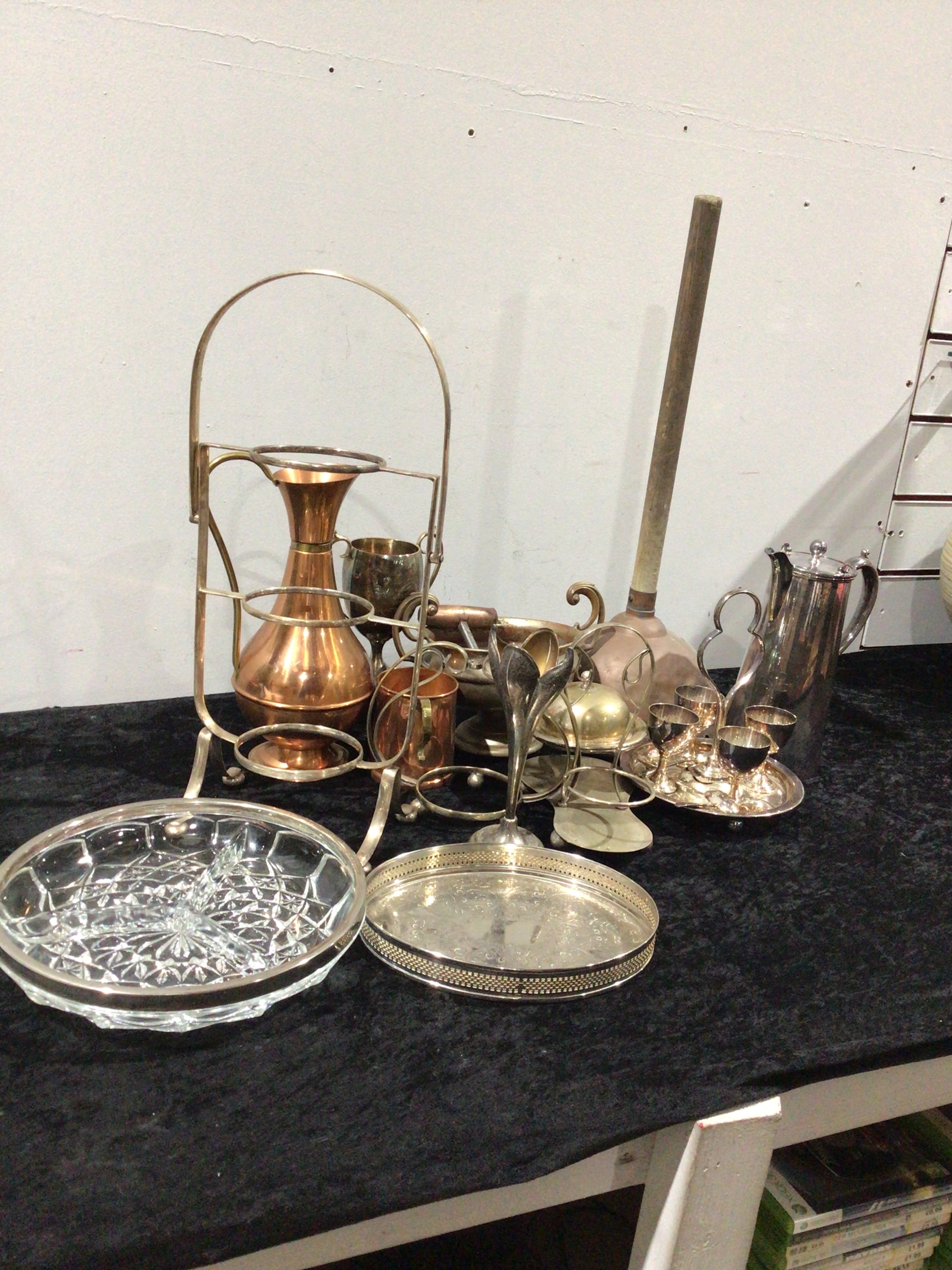 A collection of approximately 16 decorative and functional household items, including silver-colored and copper-toned metalware such as pitchers, trays, vases, mugs, and goblets, a clear glass divided dish with silver-toned trim, and a wooden plunger.
