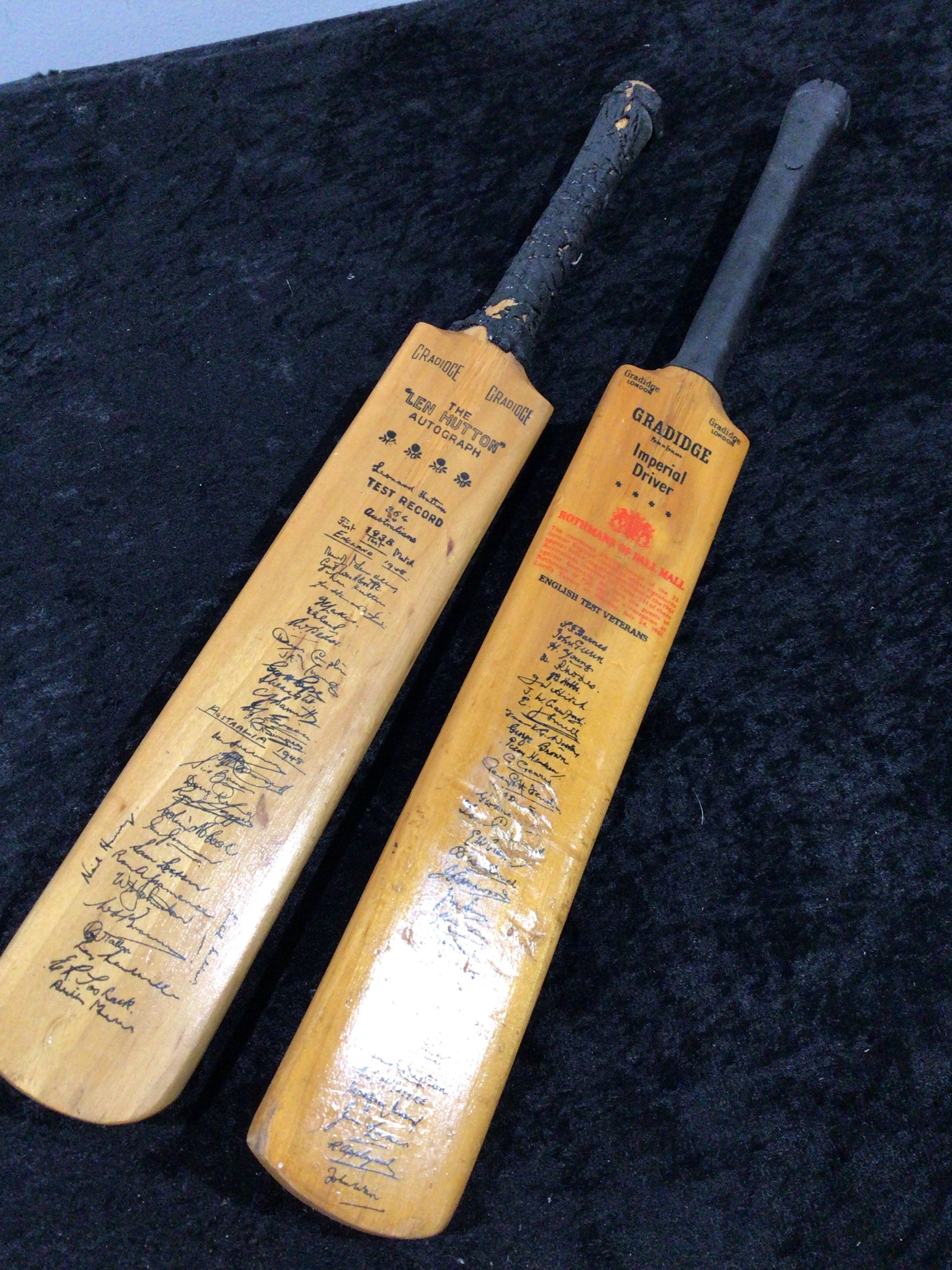 A pair of light wood miniature Gradidge London cricket bats with black grips; one ‘Len Hutton’ Autograph model inscribed ‘Leonard Hutton TEST RECORD 364 Aussies First 1938 Test England’ and ‘AUSTRALIA 1948’ with numerous signatures, the other an ‘Imperial Driver’ model with ‘Rothmans of Pall Mall’ and ‘English Test Veterans’ text, also with many signatures.