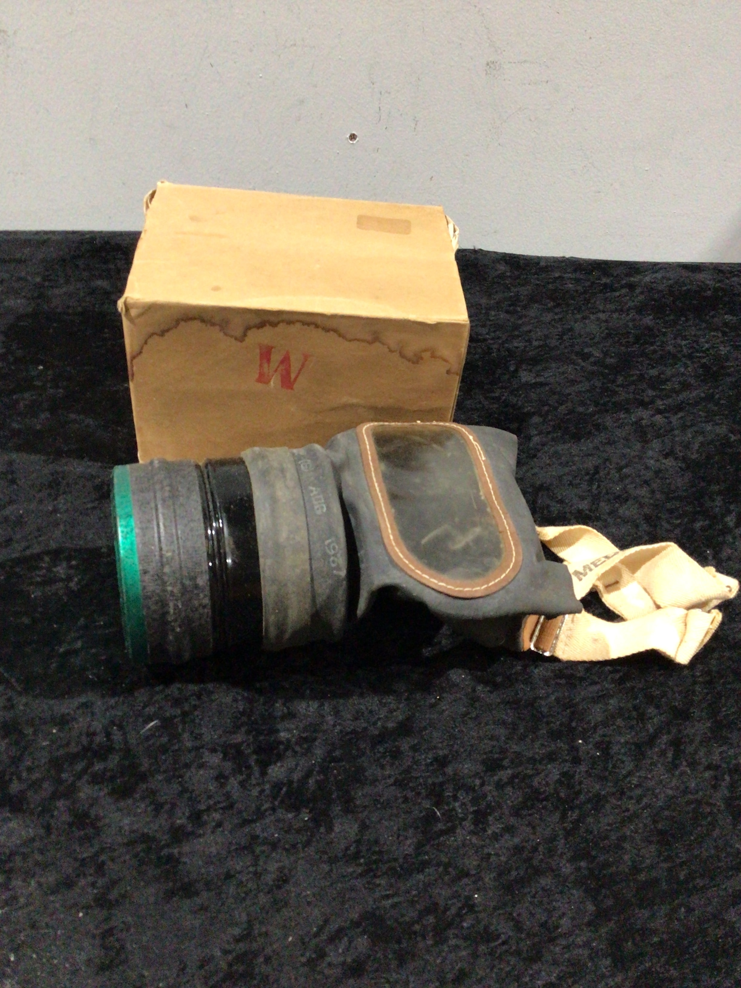 A dark gray/black gas mask filter marked “BM-10” and “1967” with a green band, attached to a dark gray/black pouch with brown trim and an off-white/tan strap marked “MEL”, accompanied by a light brown cardboard box with a red “W”.