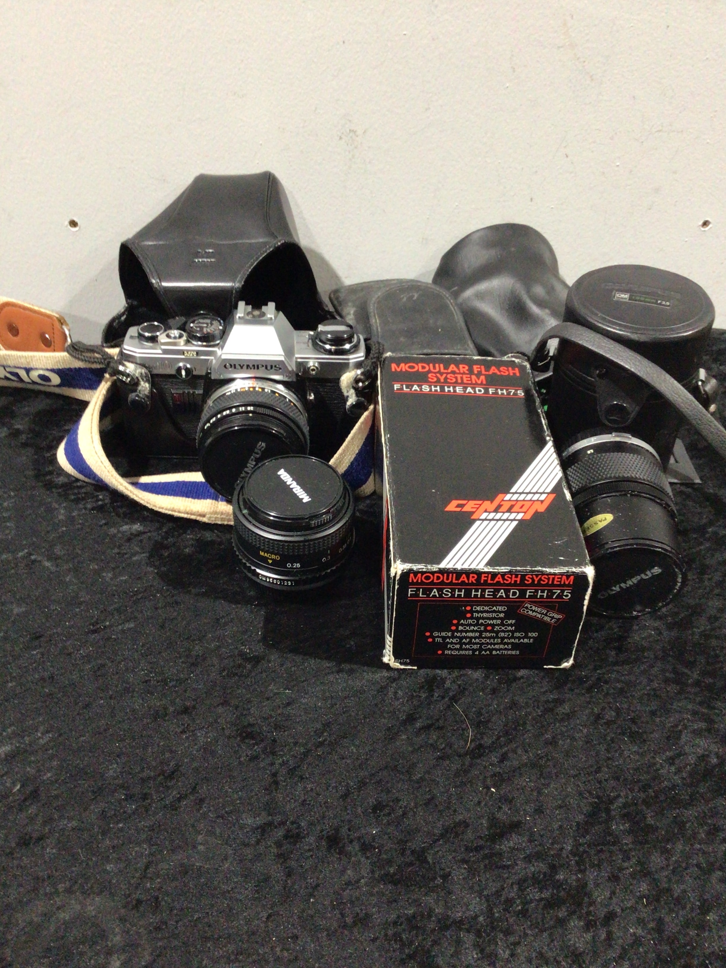 The lot contains a silver and black Olympus OM-1 SLR camera with an Olympus lens, a blue and white Olympus strap, a black leather half-case, a black Centon Modular Flash System FH.75 in its original black and red box, a black Mirage Macro 0.25 lens, and a black Olympus OM 100mm F3.5 lens.