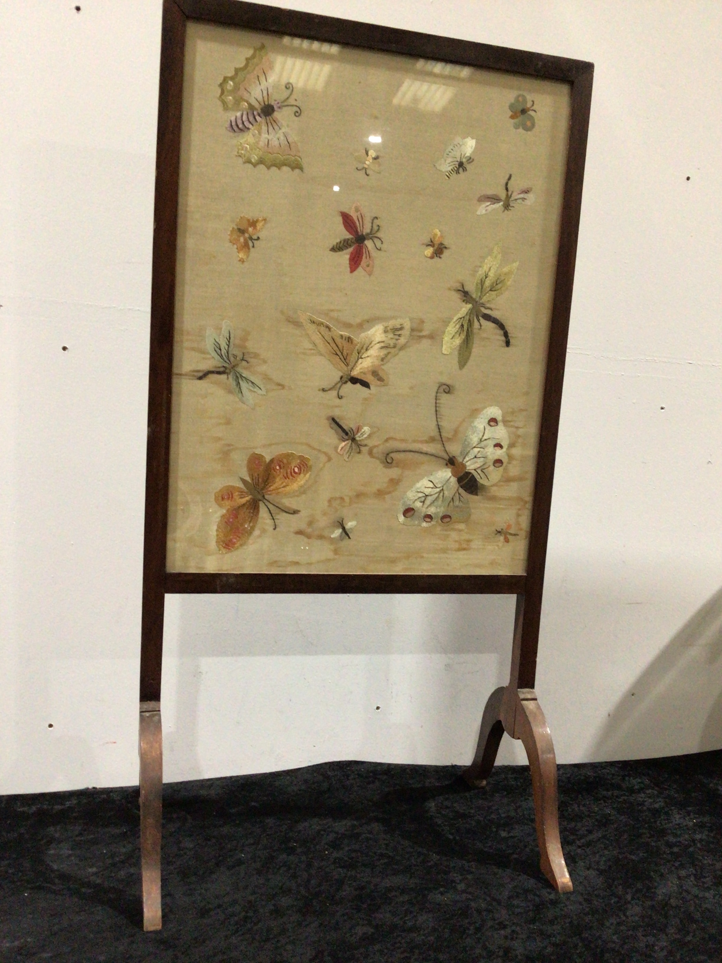 A standing screen with a dark brown wooden frame and stand, enclosing an embroidered panel depicting multiple colorful insects, primarily butterflies and dragonflies, on a light beige background.
